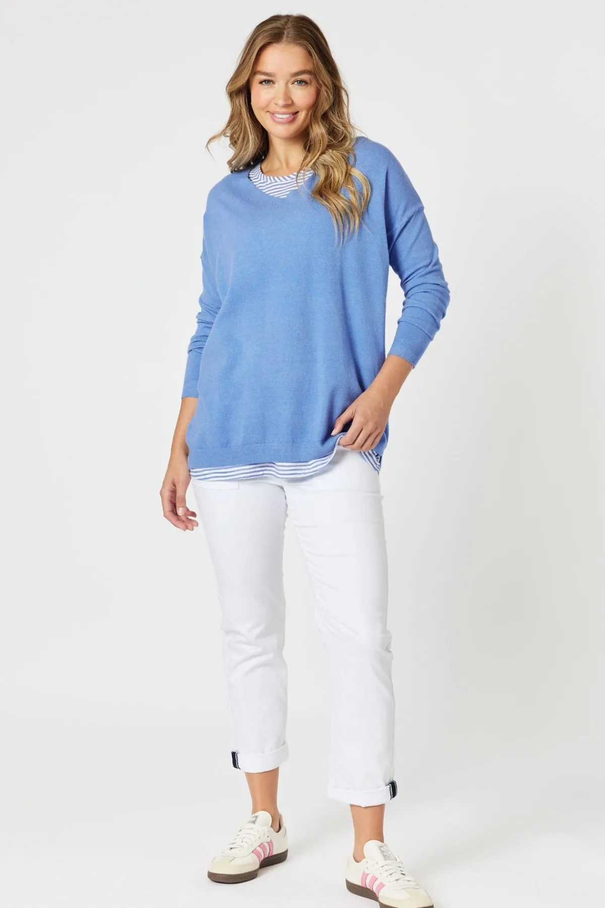 A best seller for a reason – You get 2 tops in 1. This is a beautiful lightweight knit that is perfect for layering in cooler months, but light enough that you won’t get too hot in warmer months. It comes with a 100% cotton stripe cami underneath that is detachable and great to put under any other knits or shirts. Casual and comfortable, it’s your go-to for everyday wear with just the right touch of polish.