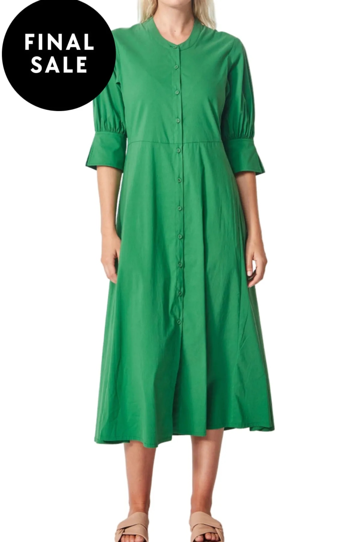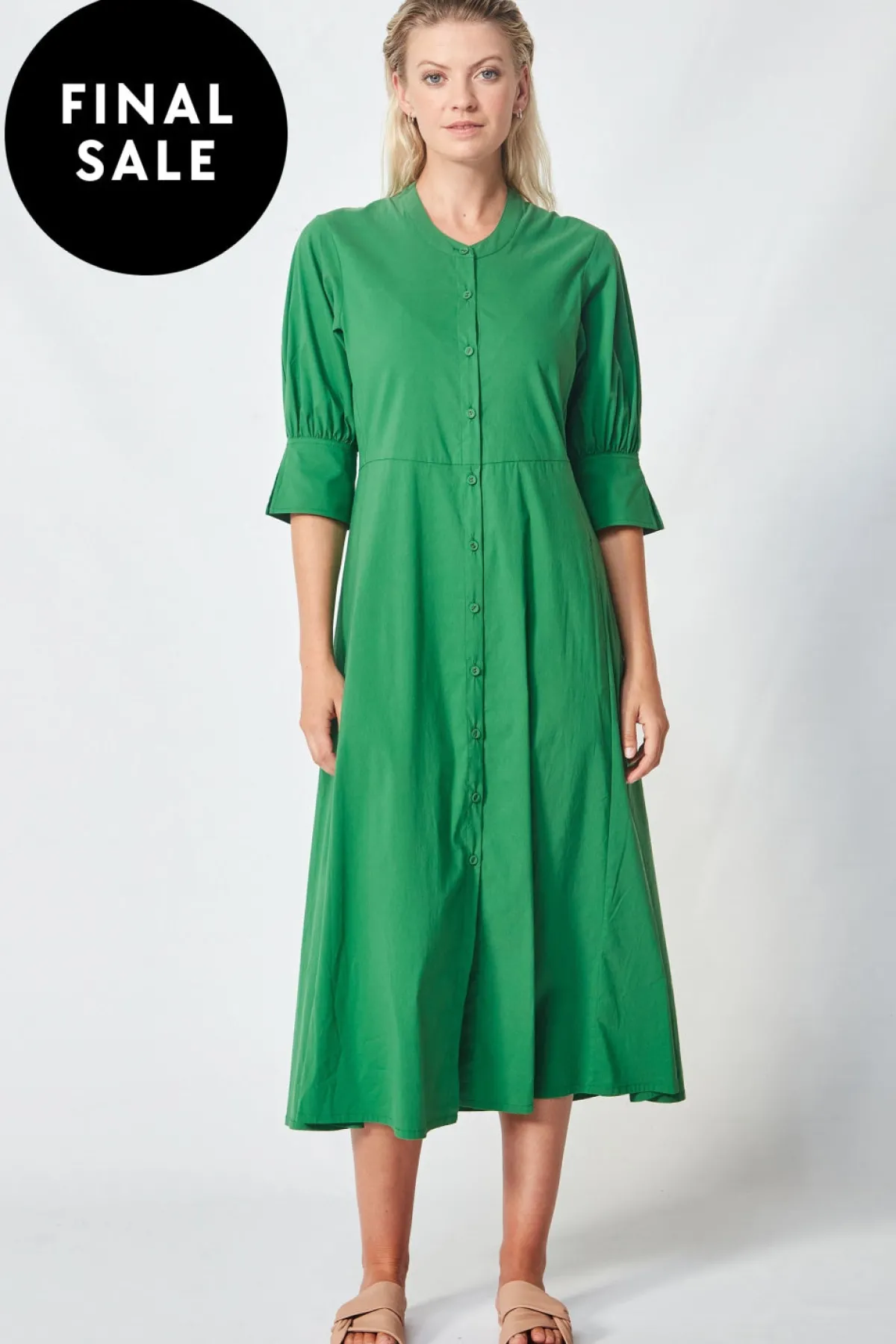 A button through shirt dress in Verge’s exclusive European stretch, cotton Acrobat fabric.The Garcia dress has a flat Mandarin collar and buttons through the front with self fabric covered buttons. The Garcia dress is waisted with A line panelled skirt.Set in sleeve falls just below the elbow and is gathered into a turn back cuff.The Garcia dress falls to mid calf.
