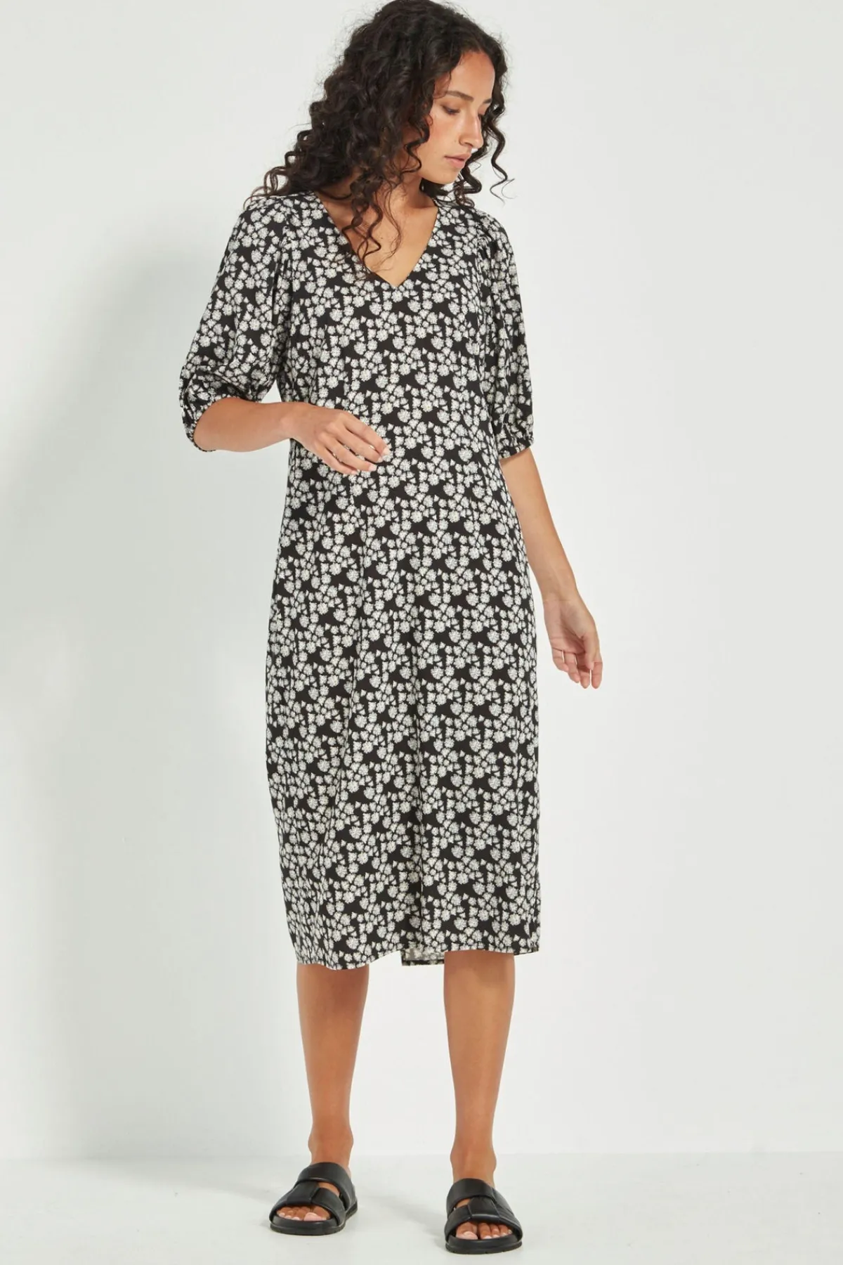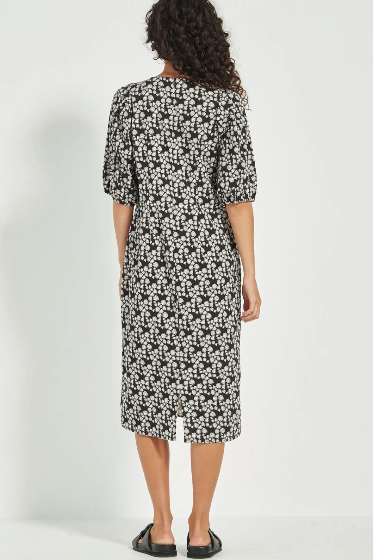 The Pixie Dress showcases the same delicate black and white ditzy print with a subtle hint of green. Crafted from stretch fabric, it is darted through the back for shape and features a back zip closure. Sleeves fall just above the elbow with elasticated hems, and the straight silhouette extends below the knee for a flattering, easy-to-wear style.
