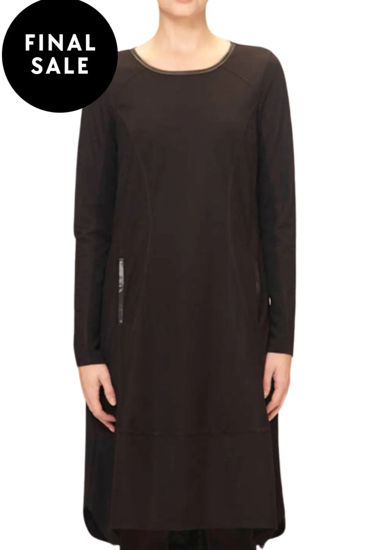 Knit dress with rib insert sleeve. Rounded neckline features Vegan leather trim. The Revolve dress is shaped with panels through the body. Vegan leather trimmed front pockets.The Revolve dress falls to mid calf.