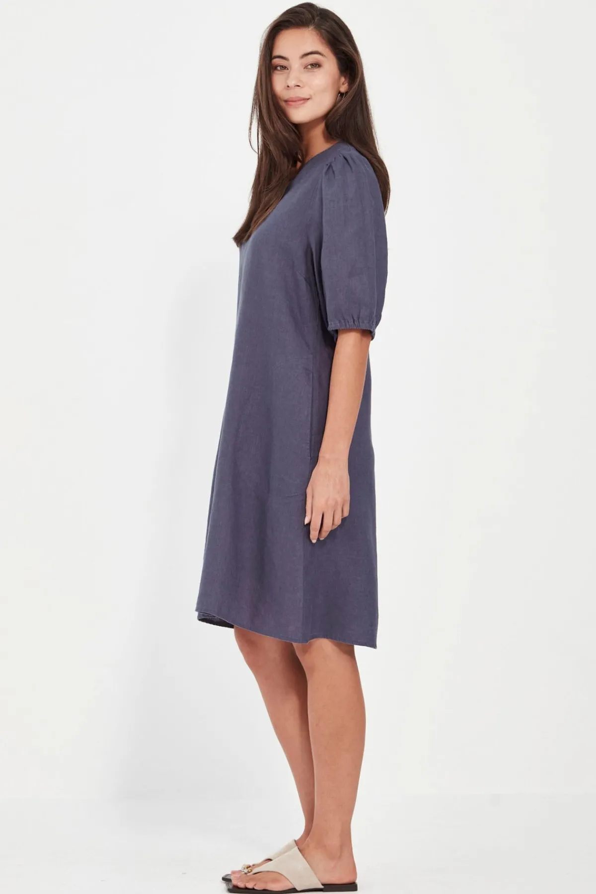 The Becky Dress is a breezy shift silhouette crafted in 100% linen—lightweight, breathable, and perfect for warmer days. Falling to just above the knee, it features a flattering scoop V-neckline and voluminous elbow-length sleeves with elasticated cuffs for a soft, gathered finish. Stitched side pockets add practical charm, while the easy fit and clean lines make it a timeless piece you’ll reach for again and again.