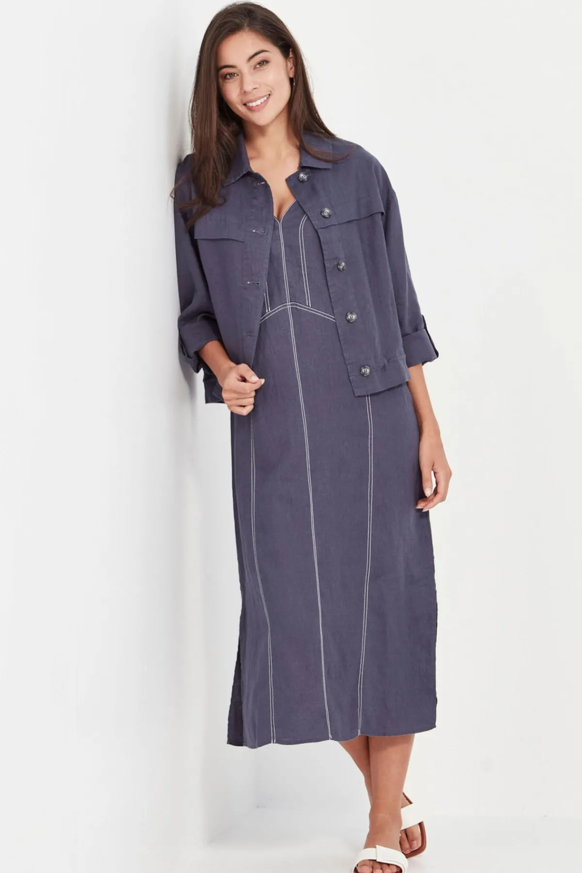 The Cordelia Dress is crafted from 100% linen in a sleeveless V-neck silhouette with contrast topstitching detail. Cut in a straight fit that flatters the body, it falls to mid-calf with side splits for ease and movement. Effortlessly versatile—wear it casually or dress it up for dinner.