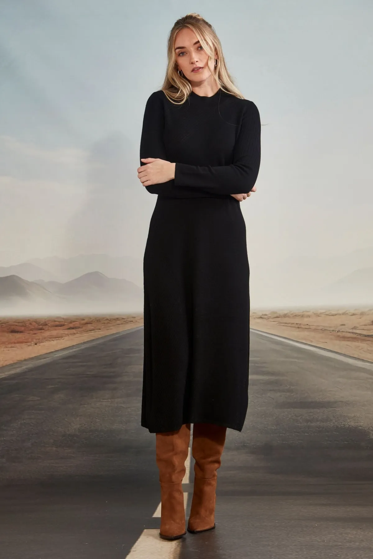 Elevate your wardrobe with the Lennox Dress. Made from 100% Merino wool, this dress boasts a high crew neckline and relaxed fit. Vertical knit panels enhance the body, while rib knit detailing on the sleeves adds a unique touch. With a full length sleeve and mid-calf length, this dress is both stylish and comfortable. Relaxed fit. Full length sleeve.