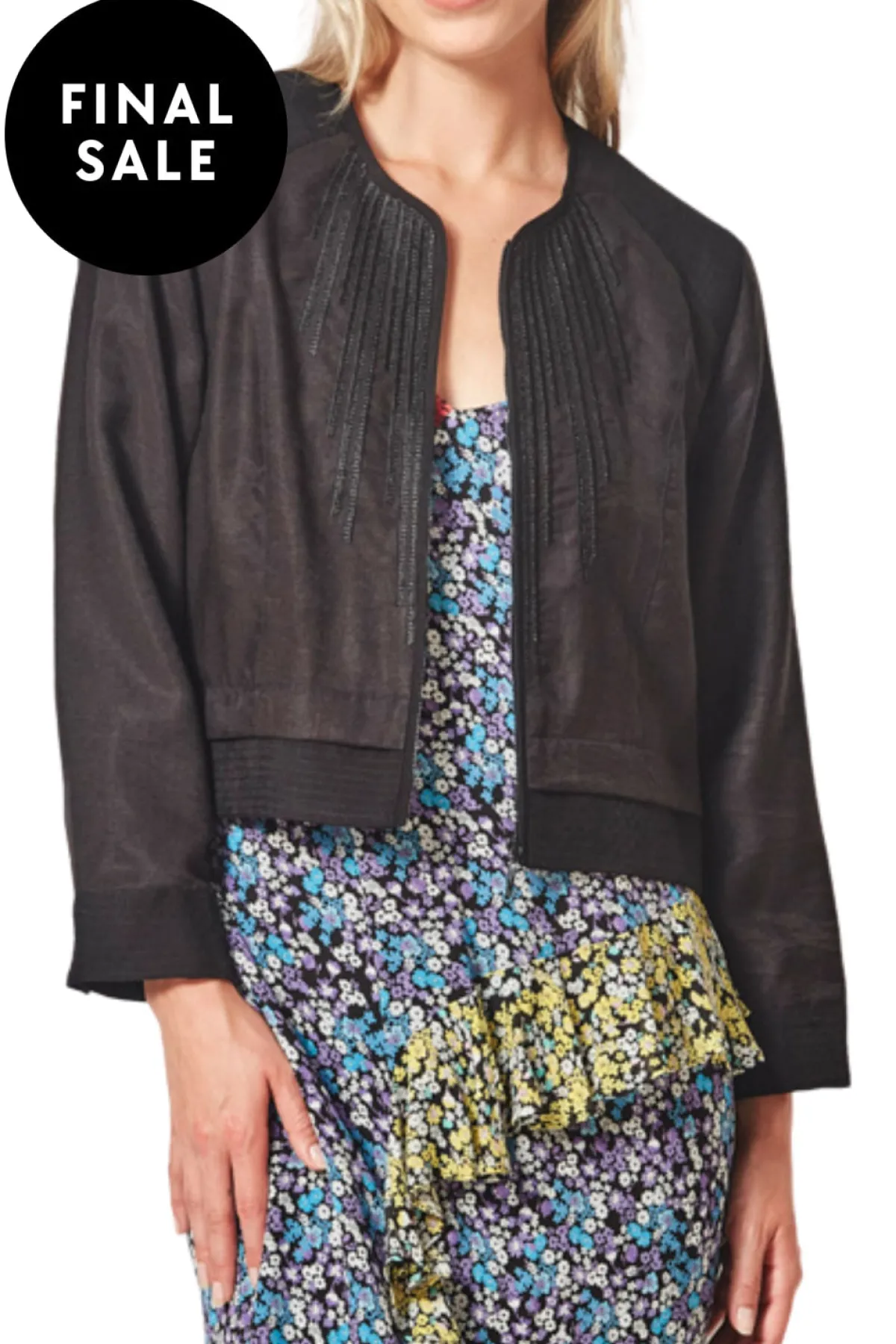 This full lined cropped jacket boasts a sophisticated zip front and collarless design. Stand out with the exquisite embroidered neckline and waist-length cut. Elevate your style with the Grade jacket, the perfect addition to your wardrobe.