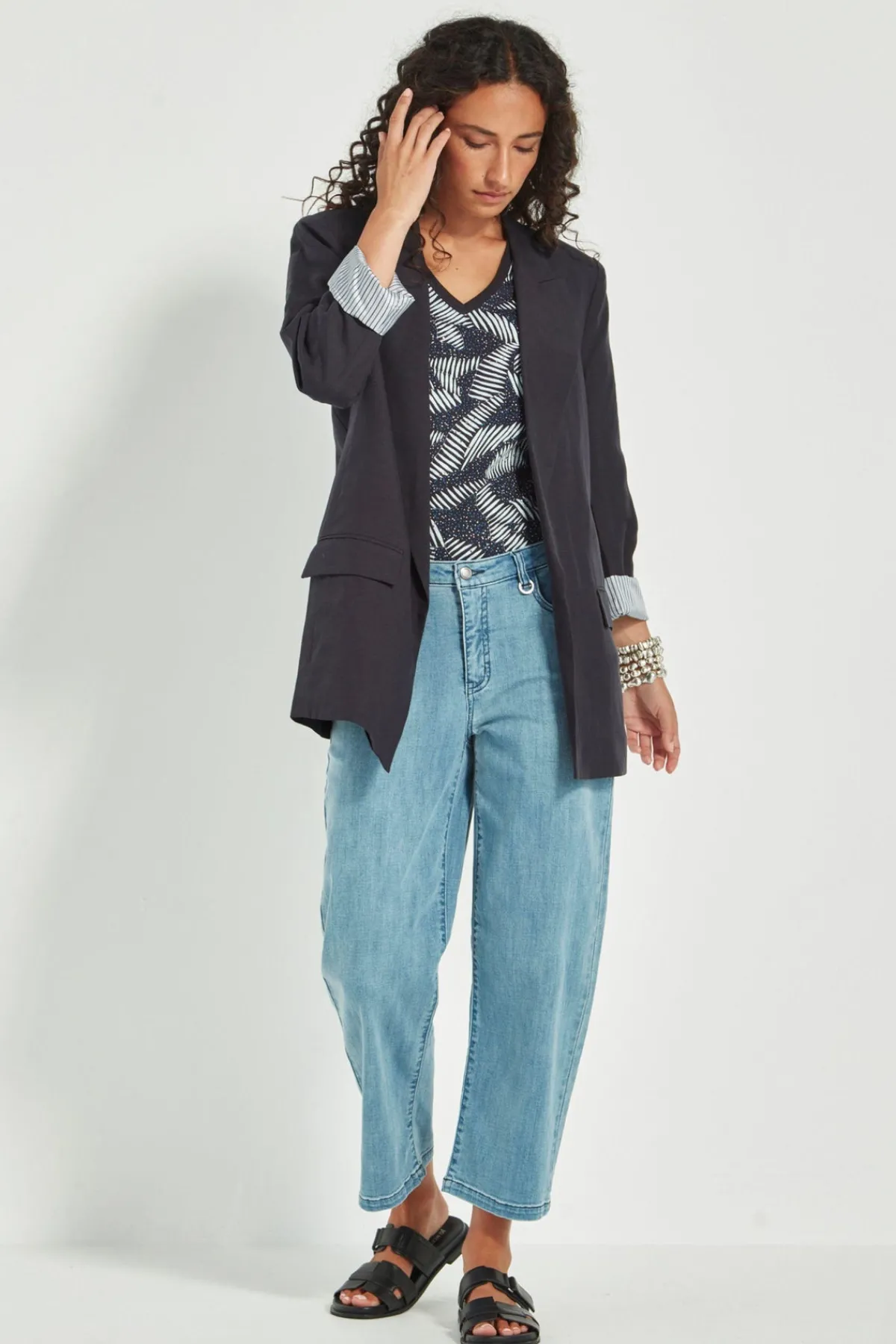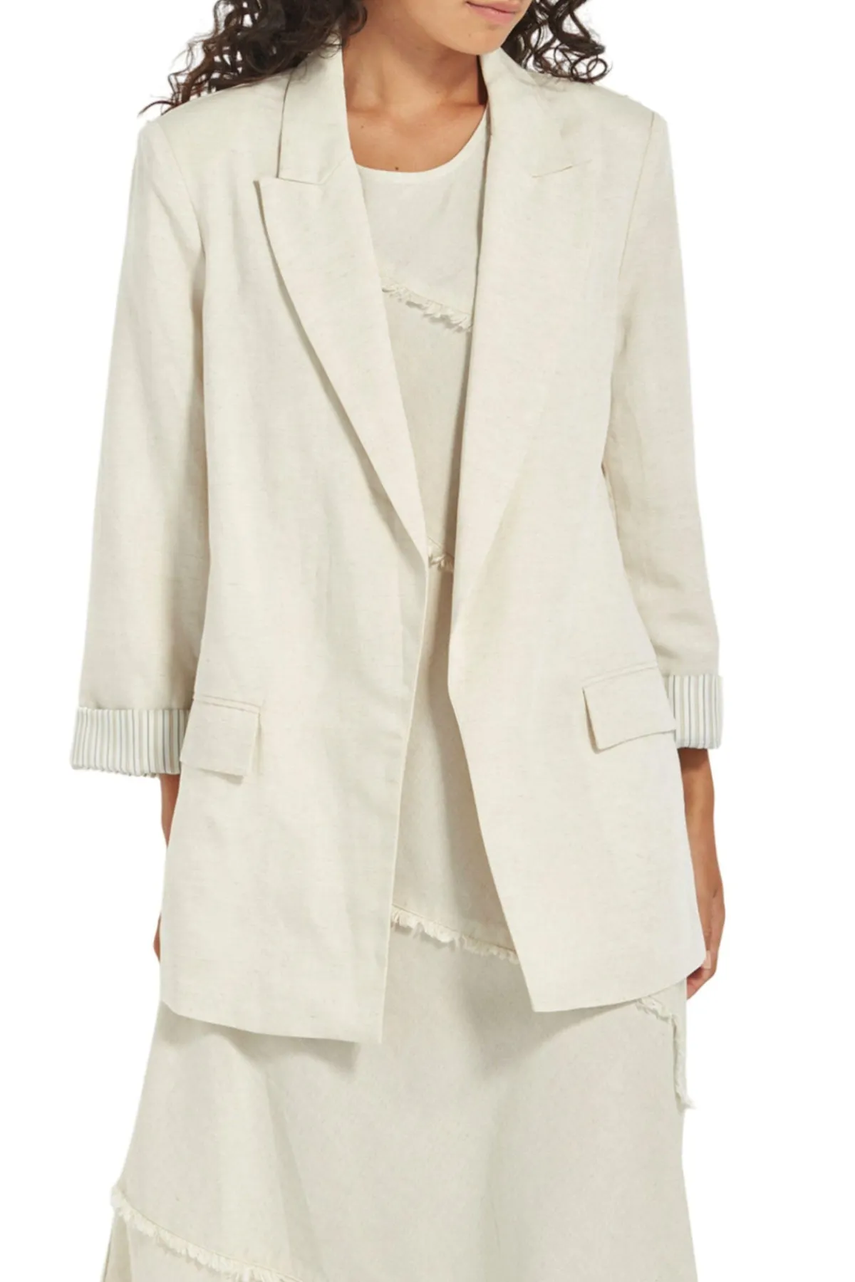 The Yara Blazer brings relaxed tailoring to life with effortless polish. Crafted in a soft Tencel-linen blend that drapes beautifully and is less prone to creasing than pure linen, it’s the ideal throw-on layer for elevated everyday dressing. This longer-line silhouette features welt flap front pockets, subtle stitching detail through the shoulders, and a centre back seam for added structure. A striped sleeve lining adds a modern twist—perfect for turning back the cuffs. Wear with the matching Pioneer Pant.
