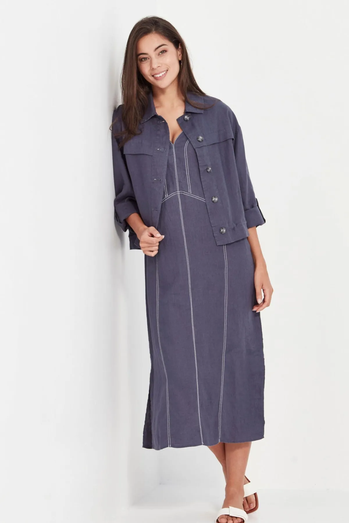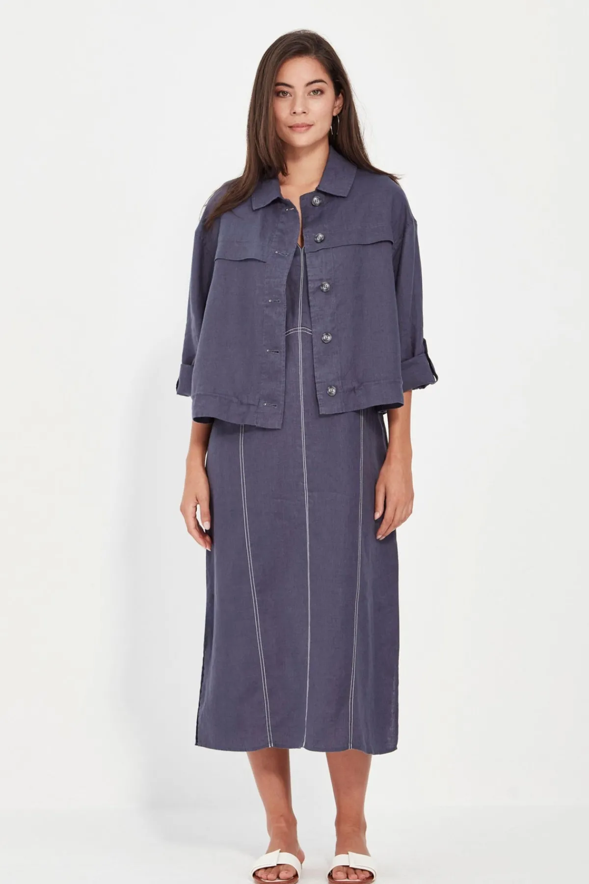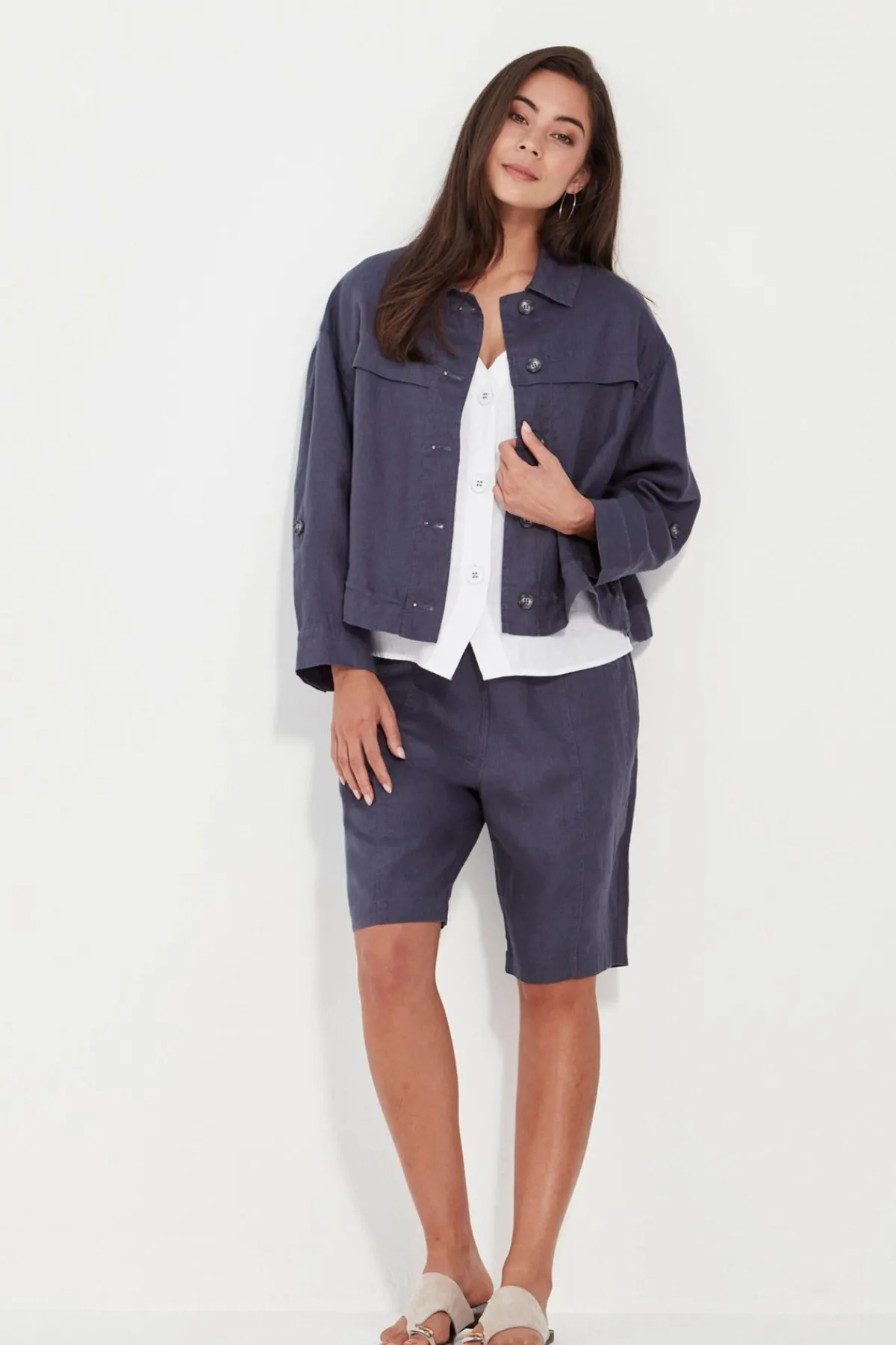 The Echo Jacket is a relaxed-fit utility style crafted from 100% linen. It features a button front, classic collar, and full-length sleeves that can be rolled to the elbow with a button tab. An internal drawcord allows you to cinch the waist for shape. Lightweight and versatile, it pairs perfectly with pants or works as an easy summer layer over dresses.