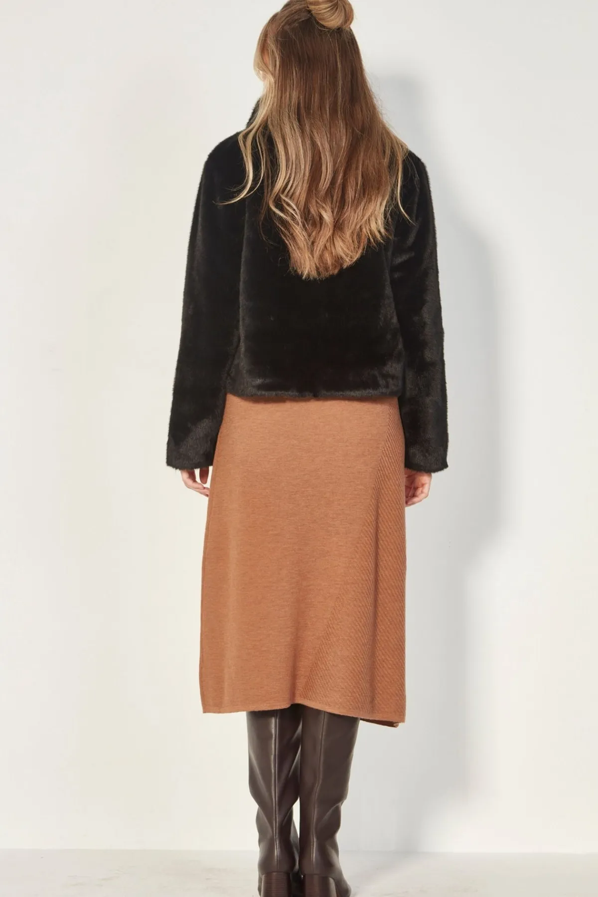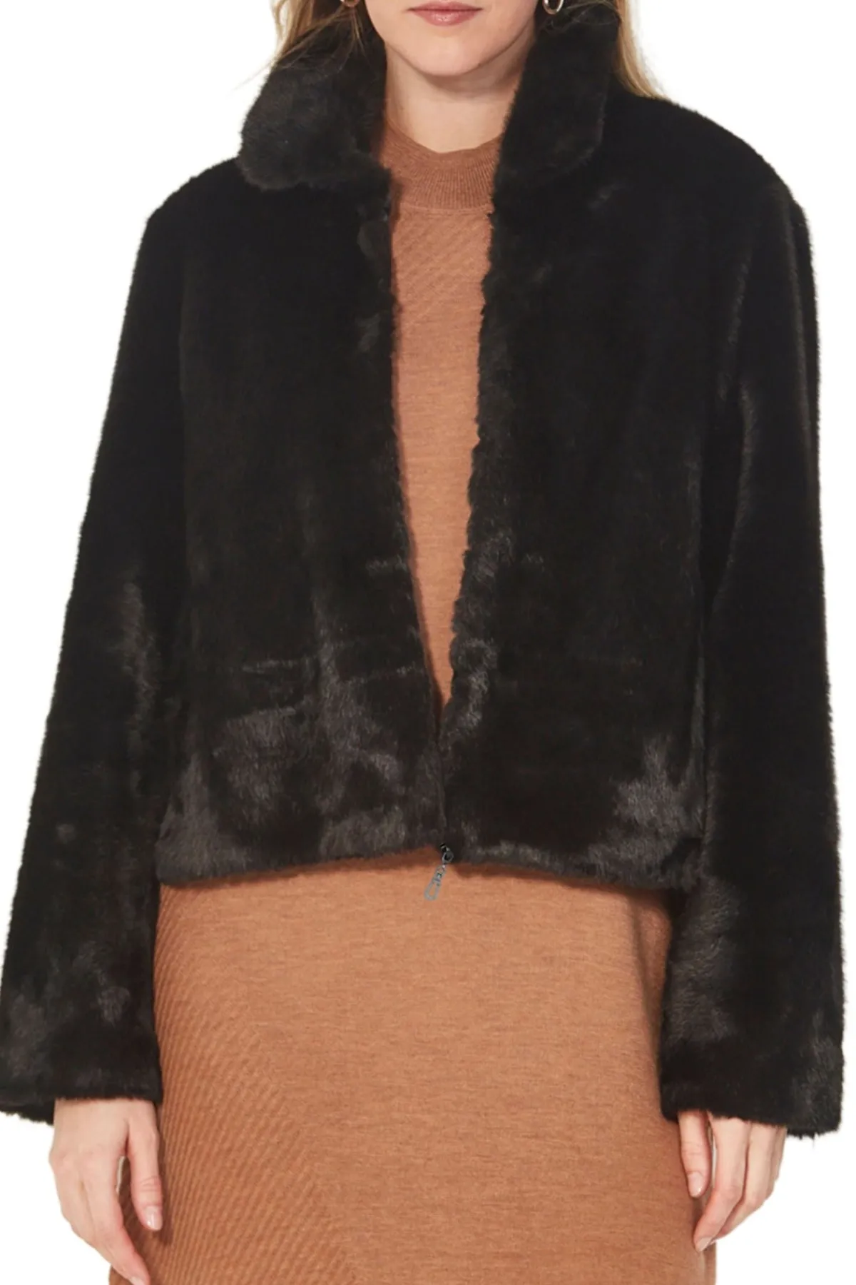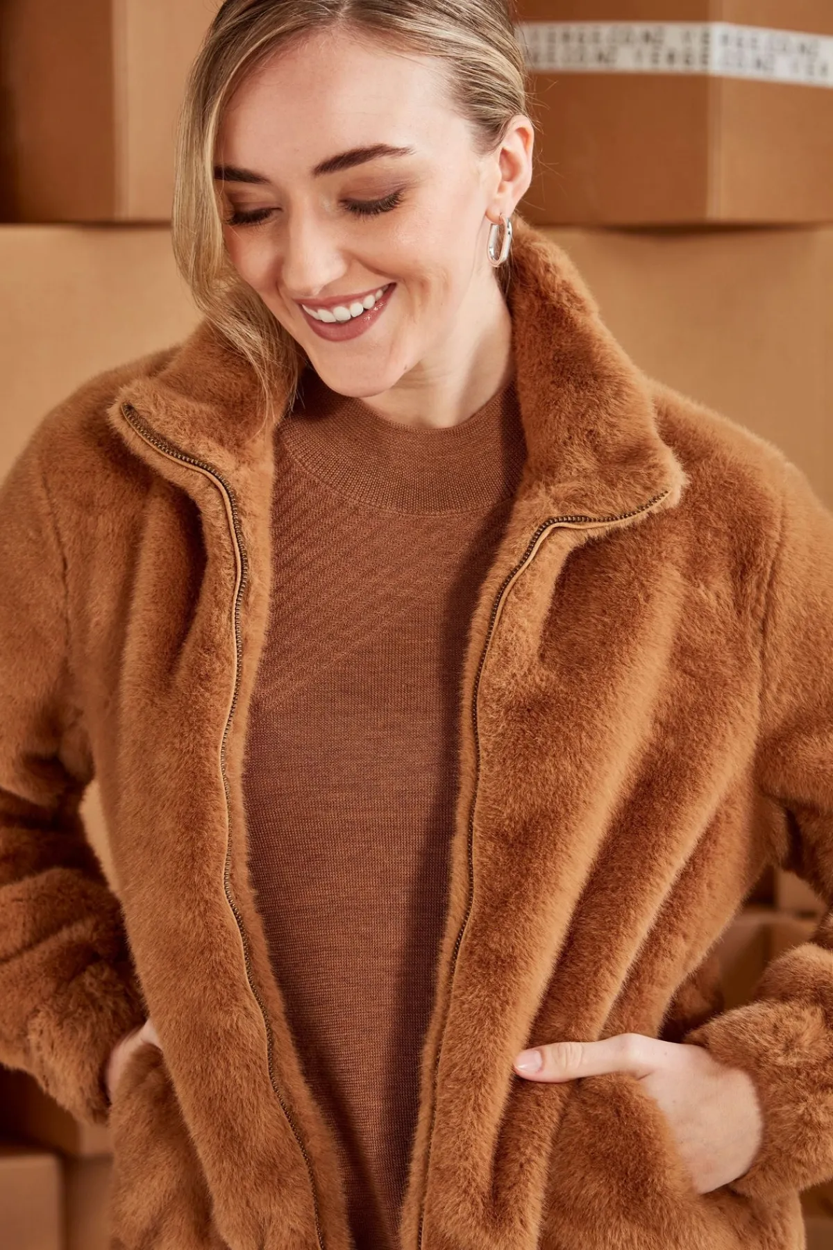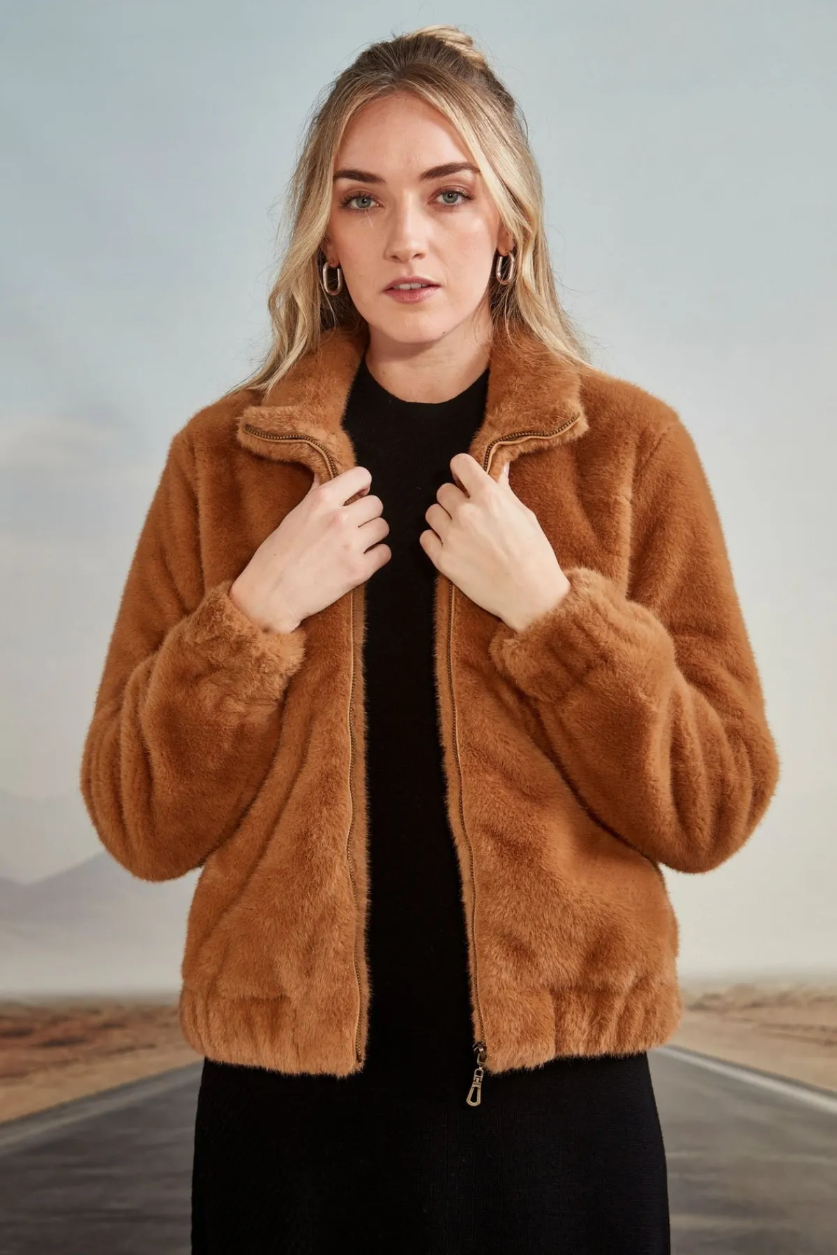 Faux fur bomber jacket with front zip entry and high collar. Zip goes up to the top of the collar. Full length sleeve with concealed elasticated cuff. The Parade jacket falls to the hip with concealed elasticated hemline.