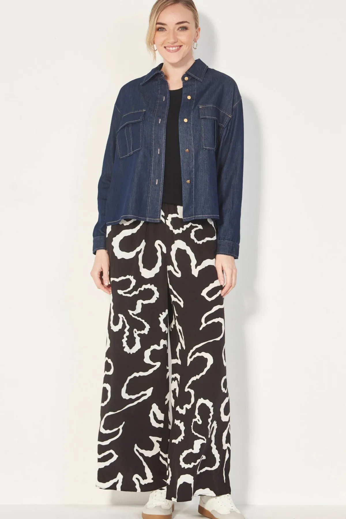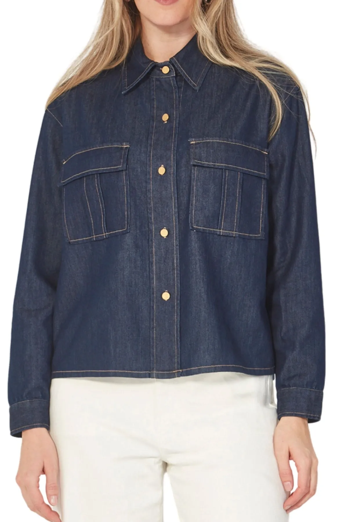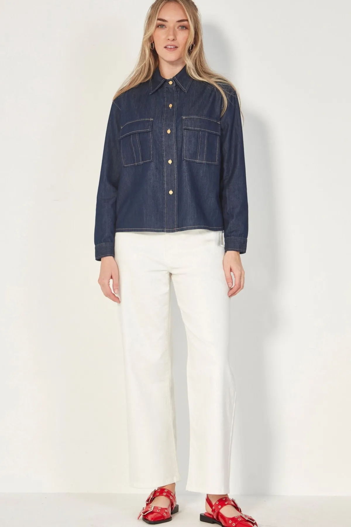 This Denim jacket features a classic collar and functional front pockets, making it a versatile and stylish addition to any wardrobe. The front pockets and bracelet-length sleeves add a touch of sophistication. The Stevie jacket sits just below the hip. Collared jacket with front breast pockets. Button through the front. Bracelet length sleeve. Back yoke. Falls to hip.