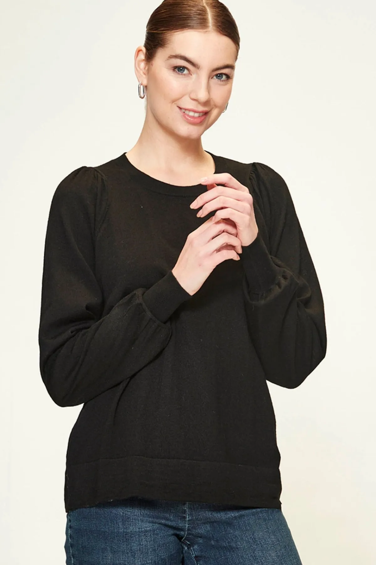 The Bronte Sweater is 100% Merino with a rounded neckline and gather details on shoulder.Bracelet length sleeve with deep rib cuff.The Bronte Sweater falls to the hip.