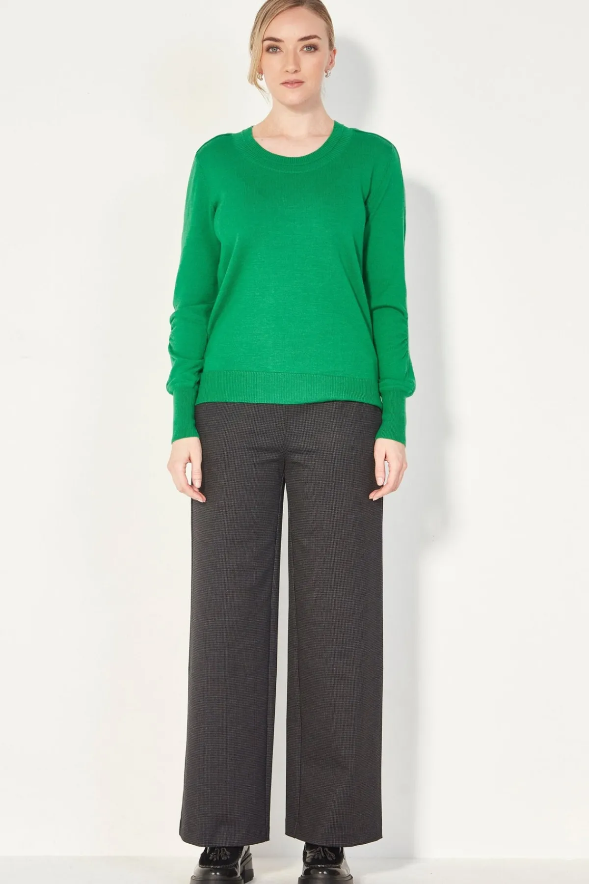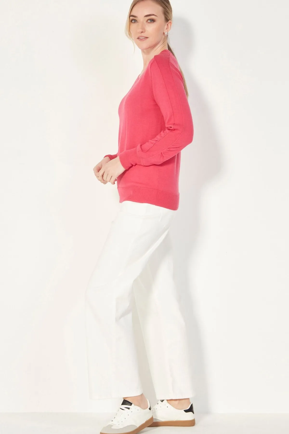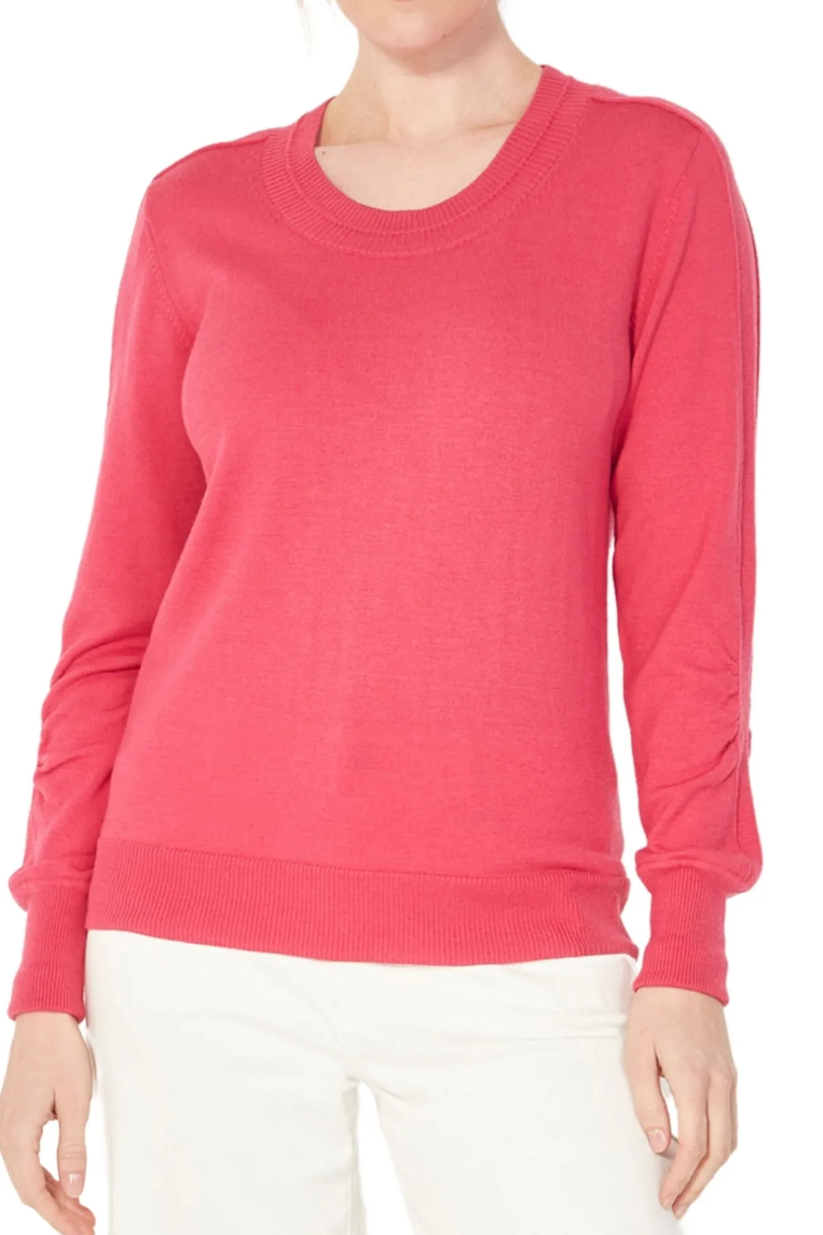 100% Merino sweater ribbed, scoop crewneck. Set in sleeve with seam detail on shoulder and along the arm. Full length sleeve with deep rib cuff and ruched detail on elbow. The Cole sweater falls below the hip with ribbed hem.