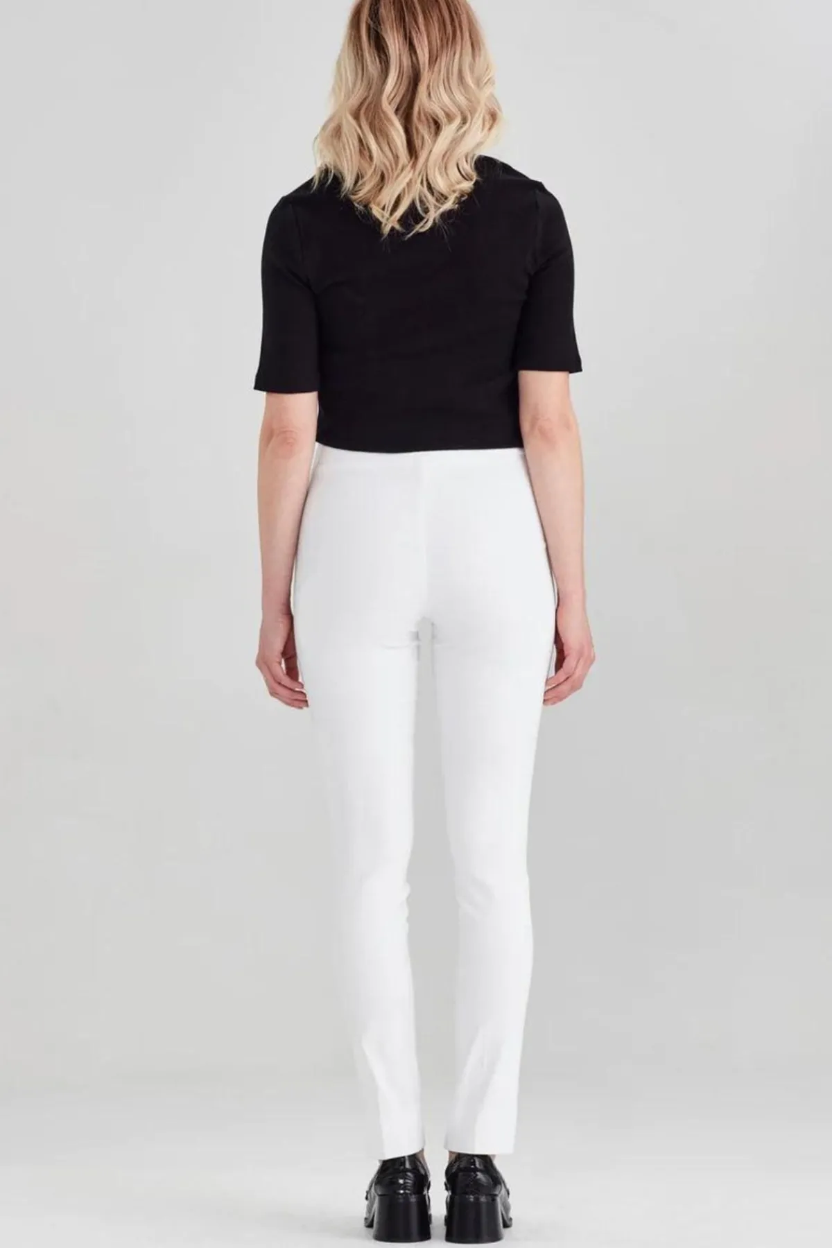The Premier pant is a pull on pant designed for comfort. Super soft stretch fabric that moves with you. Full length slim leg pant with curvy fit. Deep basque waistband sits flat under any top.