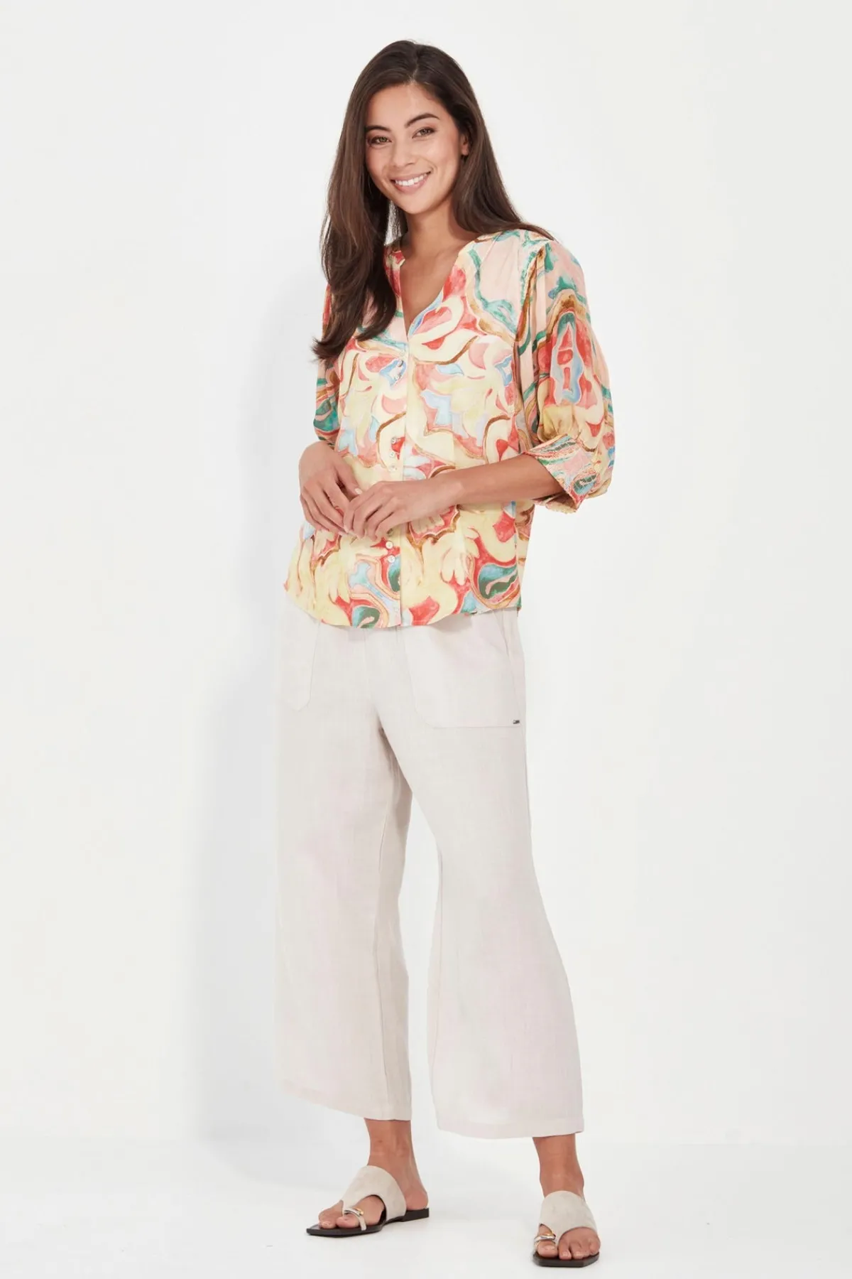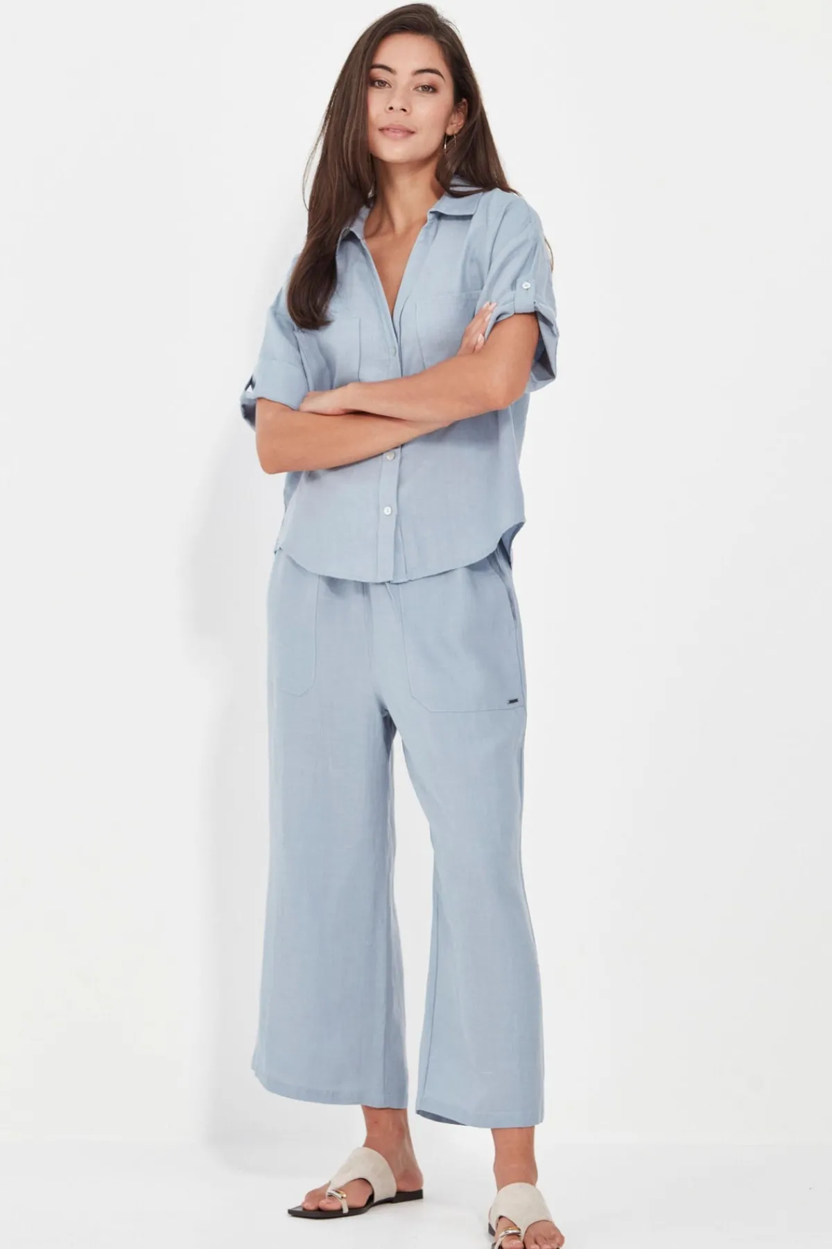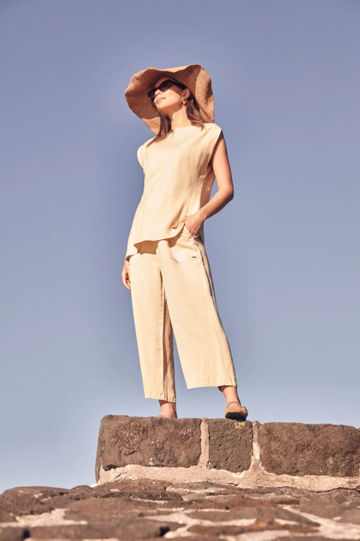 The Soho 3/4 Pant is crafted in a soft tencel-linen blend for breathability with a polished finish. Designed with a narrow elastic waistband and adjustable ties for all-day comfort, it features slant pockets and a wide, cropped leg that falls to mid-calf. An easy pull-on style that pairs effortlessly with relaxed tops or structured layers.