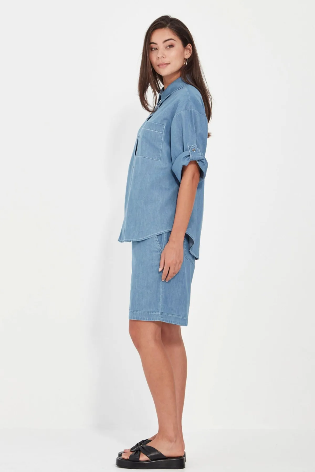 The Alex Shirt is a relaxed, modern essential crafted in soft-washed chambray denim. With a button-through front, patch pocket, and ¾ sleeves that roll up with tab detailing, it’s effortlessly cool and easy to wear. The slightly boxy fit adds a contemporary edge and pairs perfectly with the matching Alex 3/4 Pant or Short for a laid-back take on coordinated dressing.