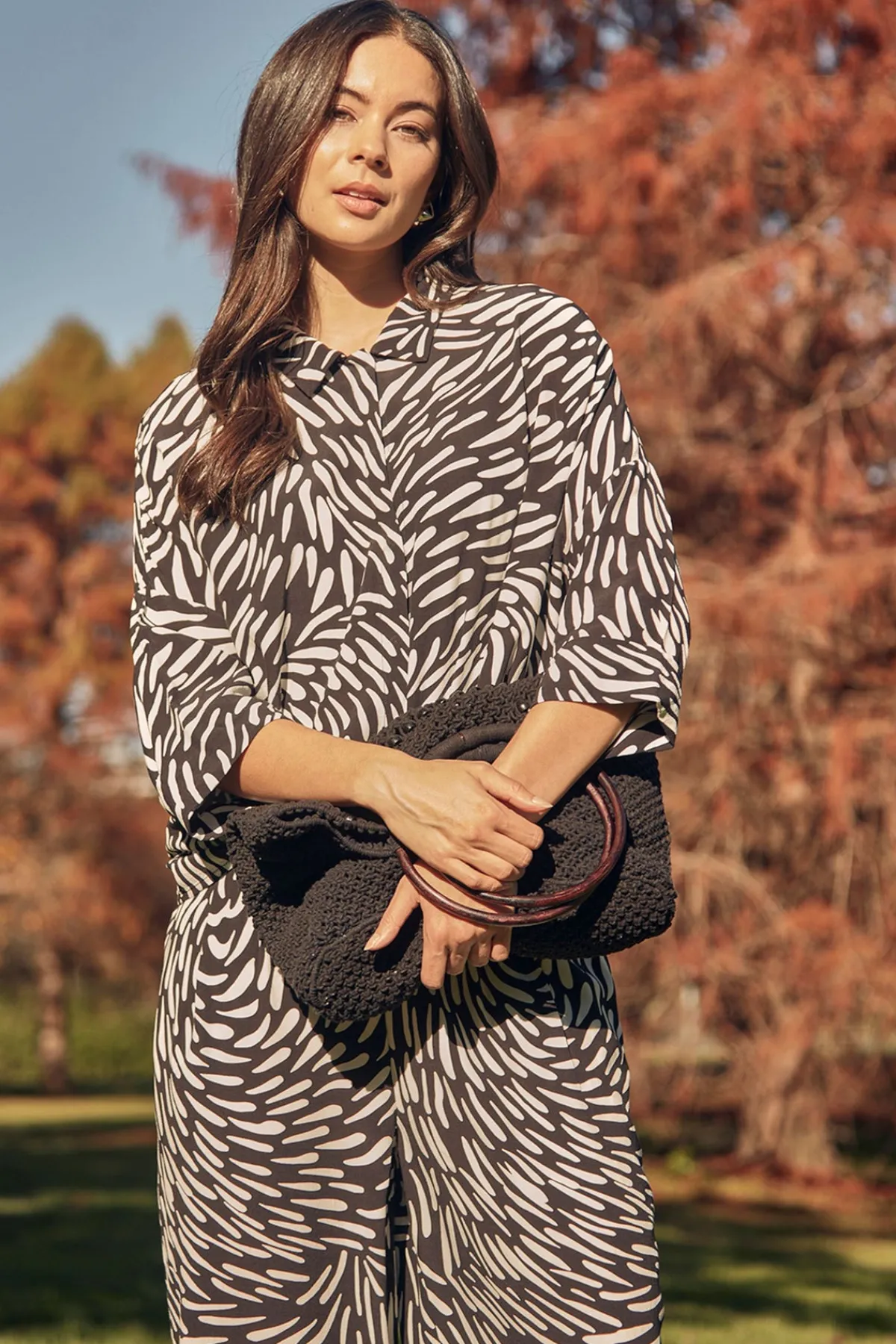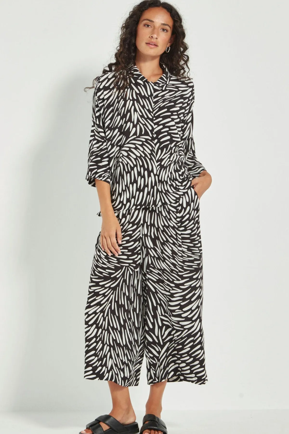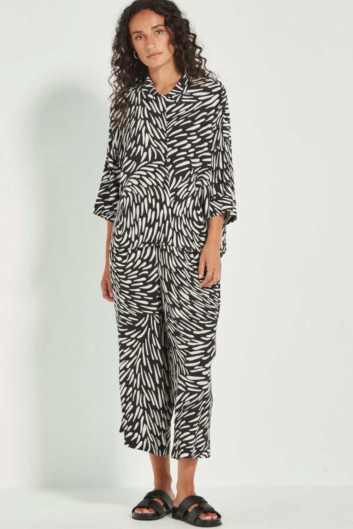 Crafted in a soft rayon-viscose blend, the Tidal Shirt is an easy, boxy silhouette elevated by a bold black-and-white abstract print. It features a clean concealed front placket, dropped shoulders, and 3/4-length cuffed sleeves for a relaxed yet modern finish. A versatile style that works just as well tucked in or worn loose. Wear with the Tidal Pant for a modern outfit solution.