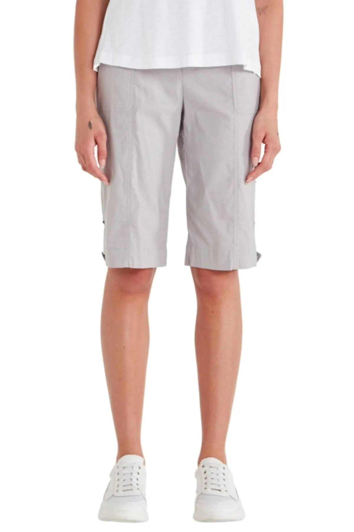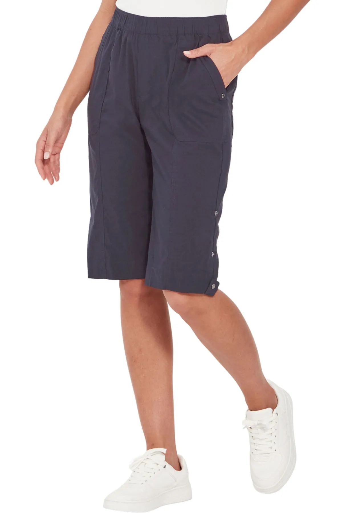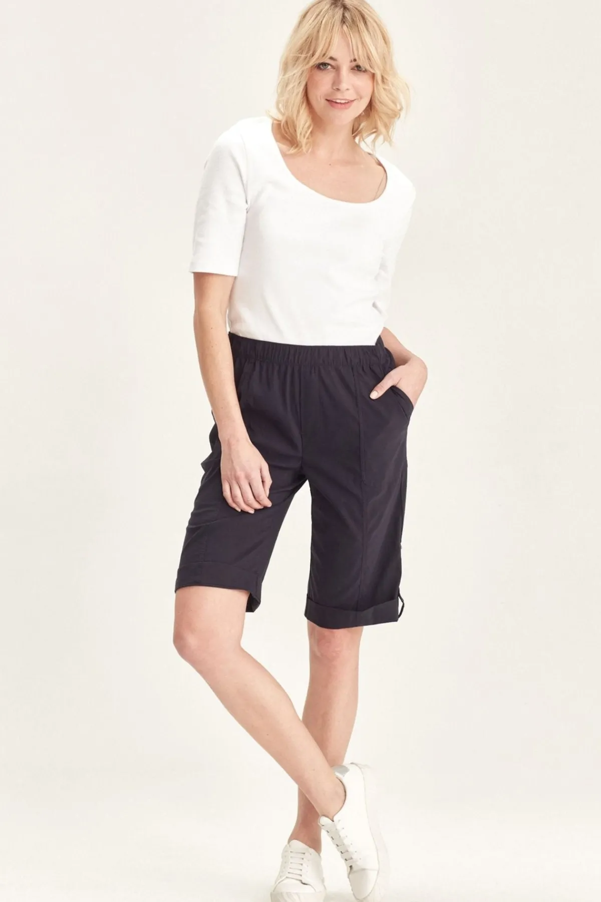 Knee length Acrobat stretch short features an easy wearing elasticated waist, patch pockets with rivet details on front and back with tabs at side to roll up hem. A classic short for every wardrobe.