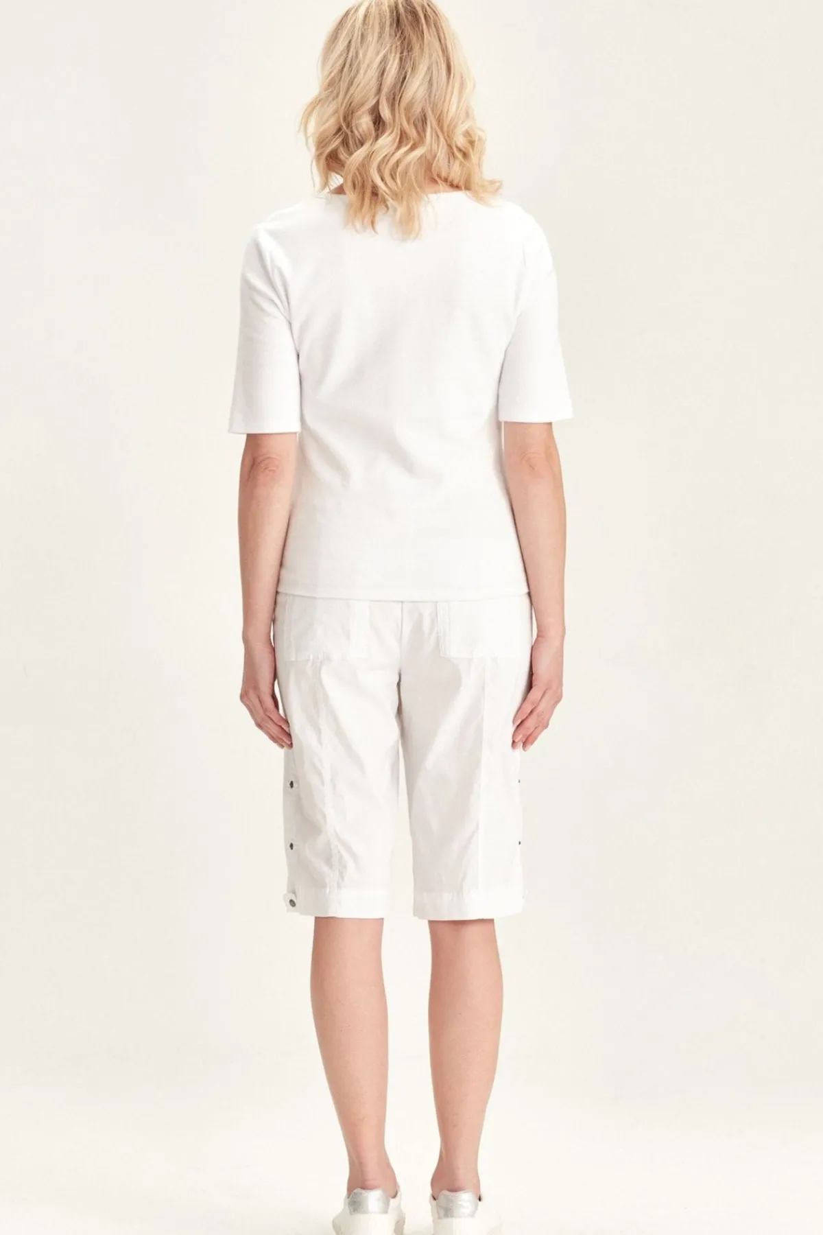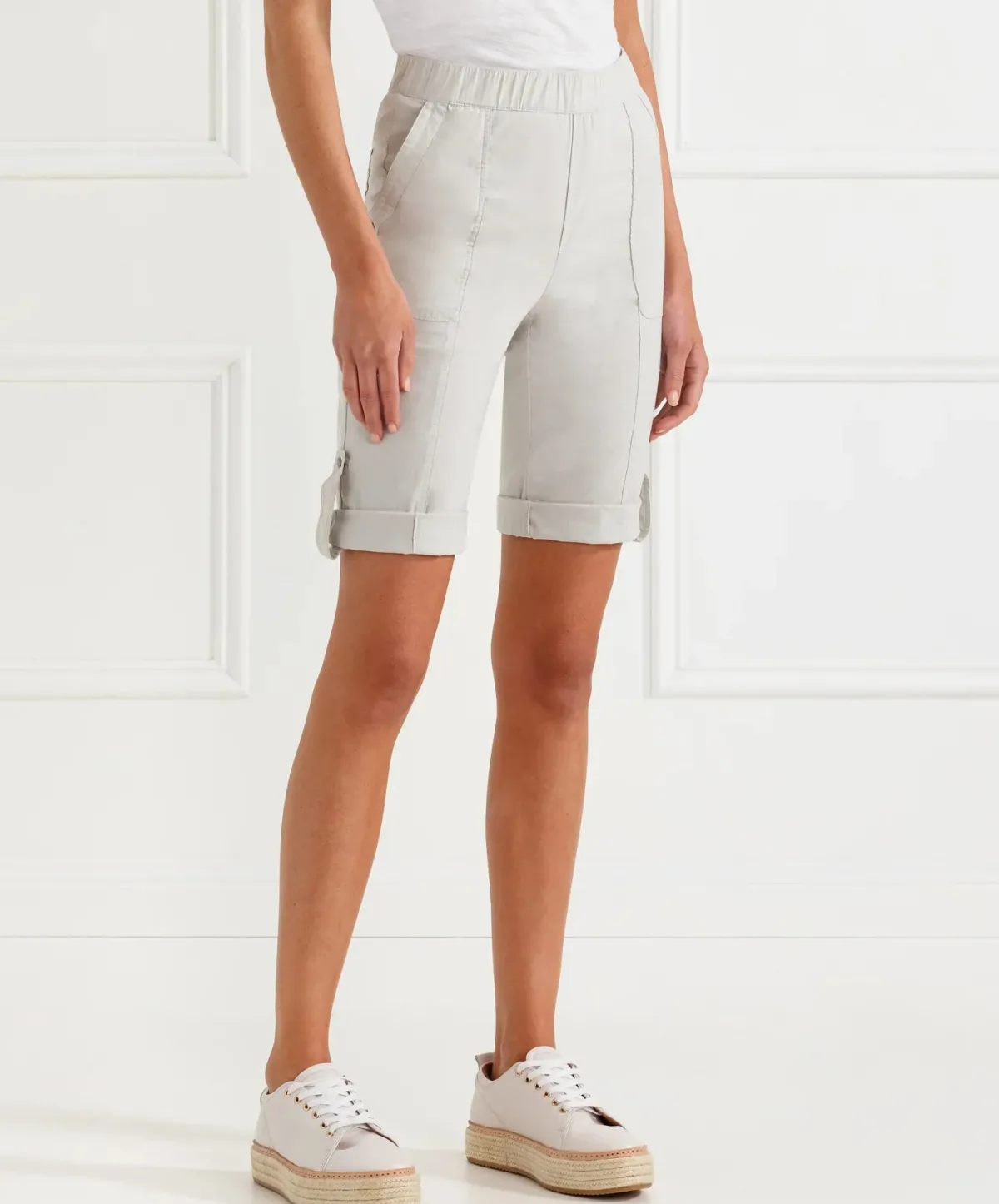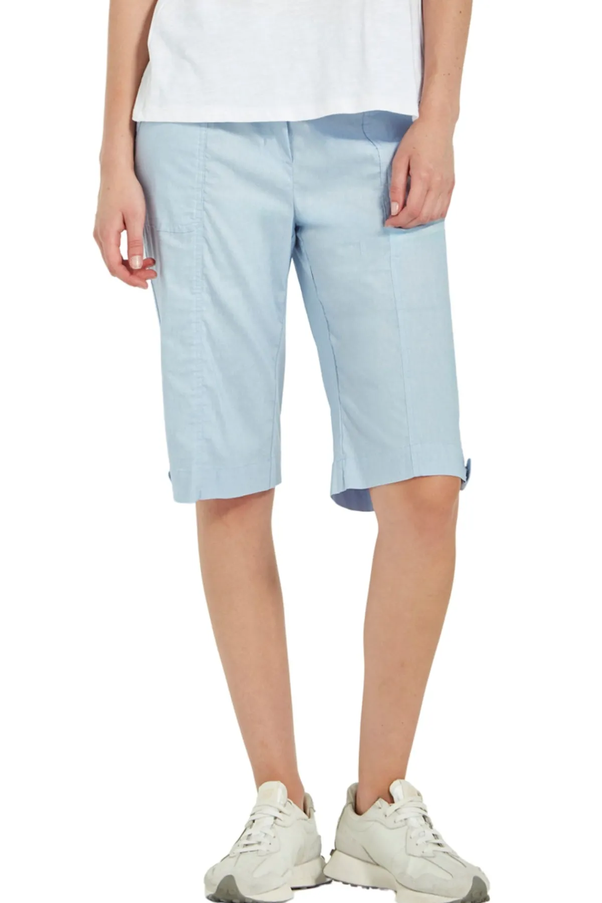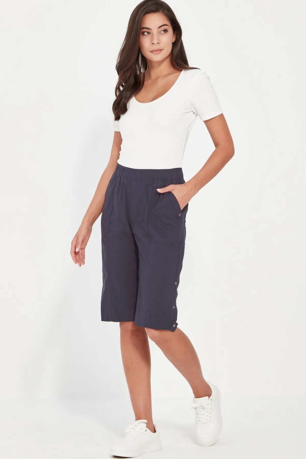 Knee length Acrobat stretch short features an easy wearing elasticated waist, patch pockets with rivet details on front and back with tabs at side to roll up hem. A classic short for every wardrobe.