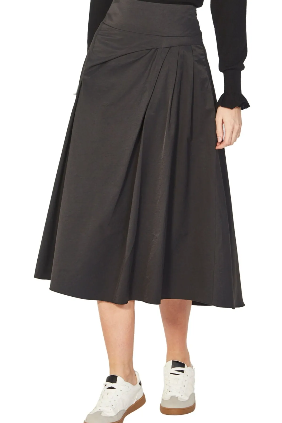 Expertly crafted from high quality Cotton blend twill our Stroll skirt in classic black features a flattering A-line silhouette and a high waisted design. The pleat detail on the side of the hip adds a touch of sophistication while the full skirt ensures comfort and style. Elevate your wardrobe with this must-have piece. A Line shape. High waisted. Shirred back waist detail. Full skirt. Falls to mid calf.