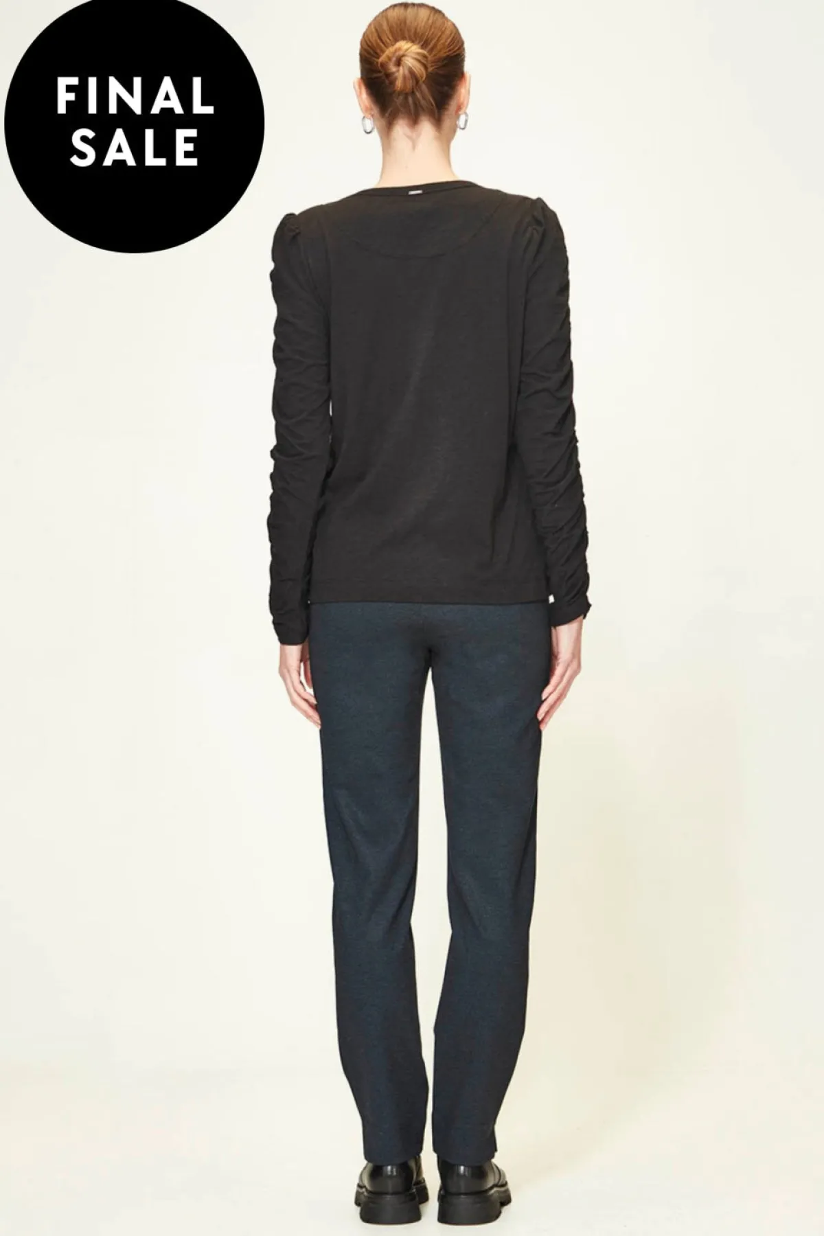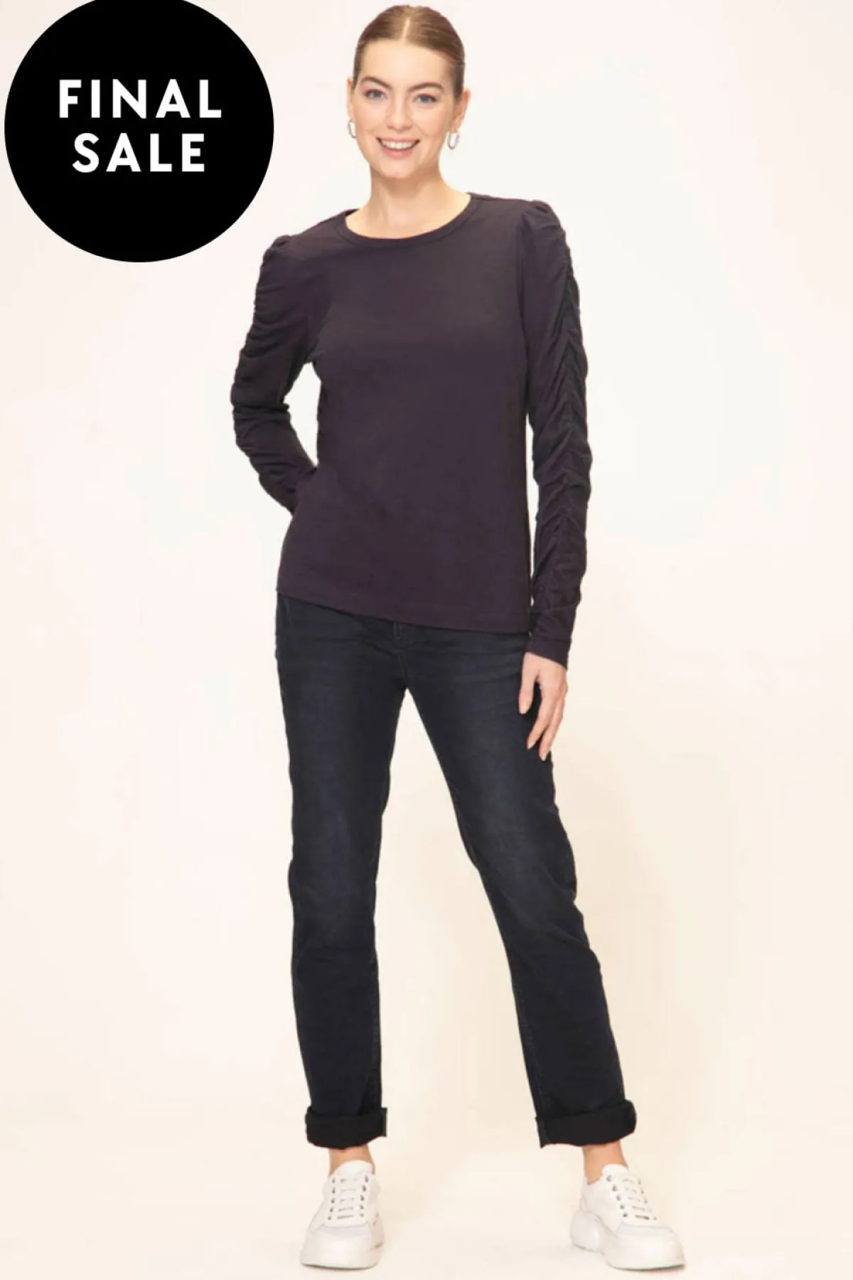 Elevate your wardrobe with the Kora Top, a sophisticated blend of cotton and Modal knit fabric. Designed to gracefully fall to the hip, this top effortlessly combines comfort with elegance. Featuring a rounded neckline for timeless charm, the sleeves boast an alluring ruched detail from top to cuff.