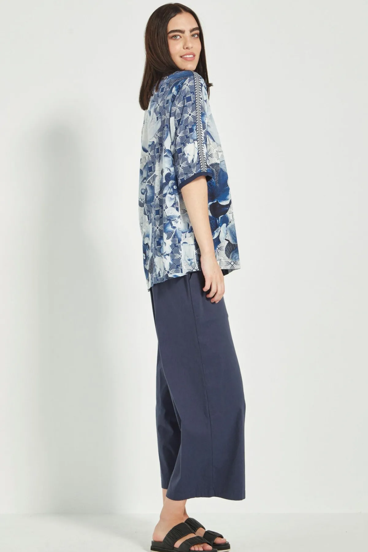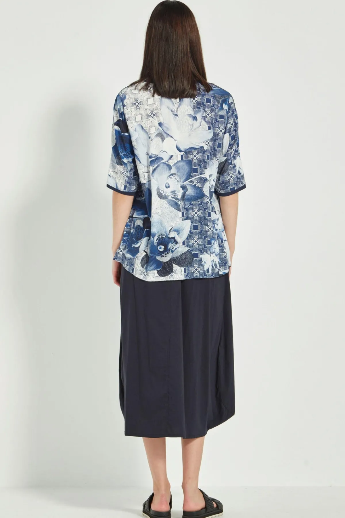 The Macy top features a printed shell design with a rib-knit trim at the neckline and cuffs, accented by a bold striped detail. A feature stripe runs from the shoulder down to the sleeve cuff, adding a sporty, modern touch. With a rounded neckline and elbow-length sleeves, this top is finished with side splits at the hem and falls to the hip for a flattering, easy-to-wear silhouette.
