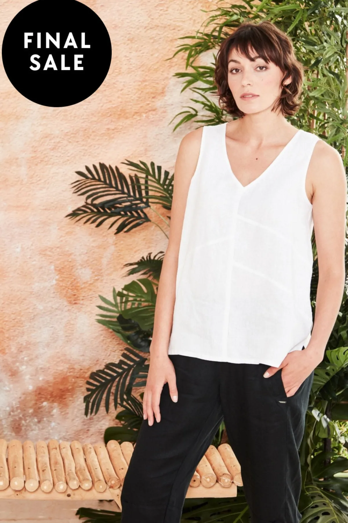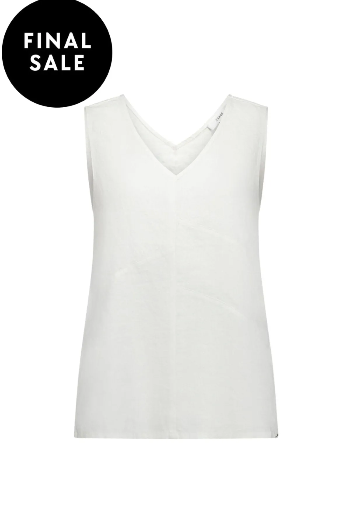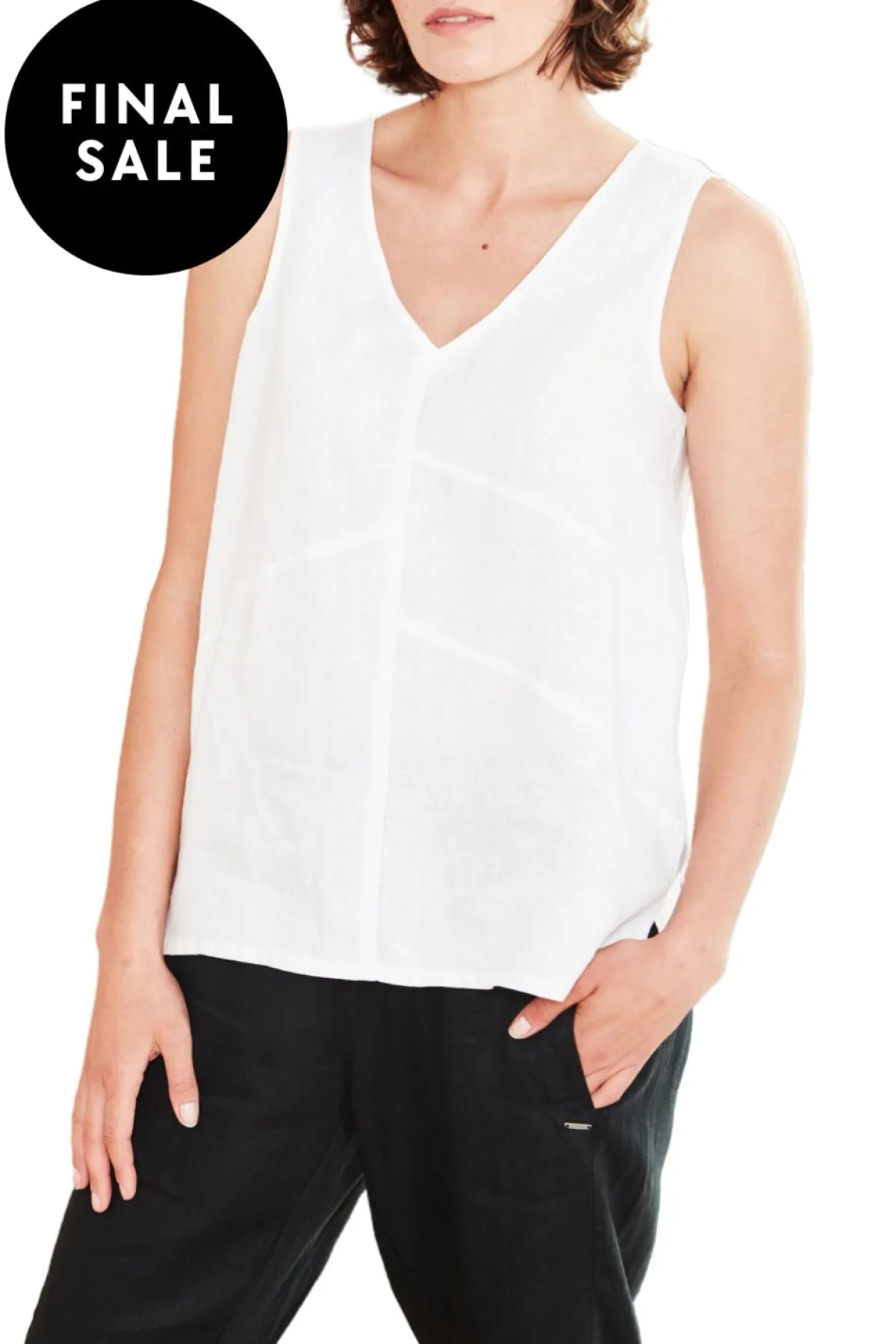 100% Linen tank with V neckline and panel detail on front of tank.The Motivation tank falls just below the hip with side splits at hem line. V neckline. Vertical front seam. Panel detail on front. Side splits. Falls to the hip.