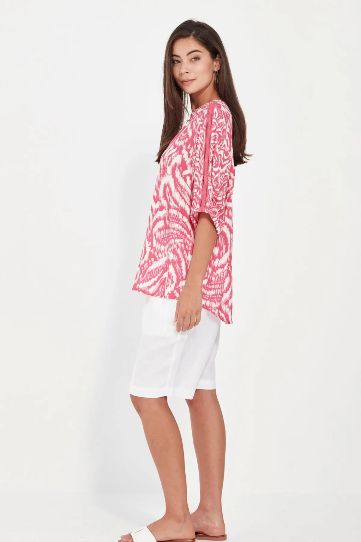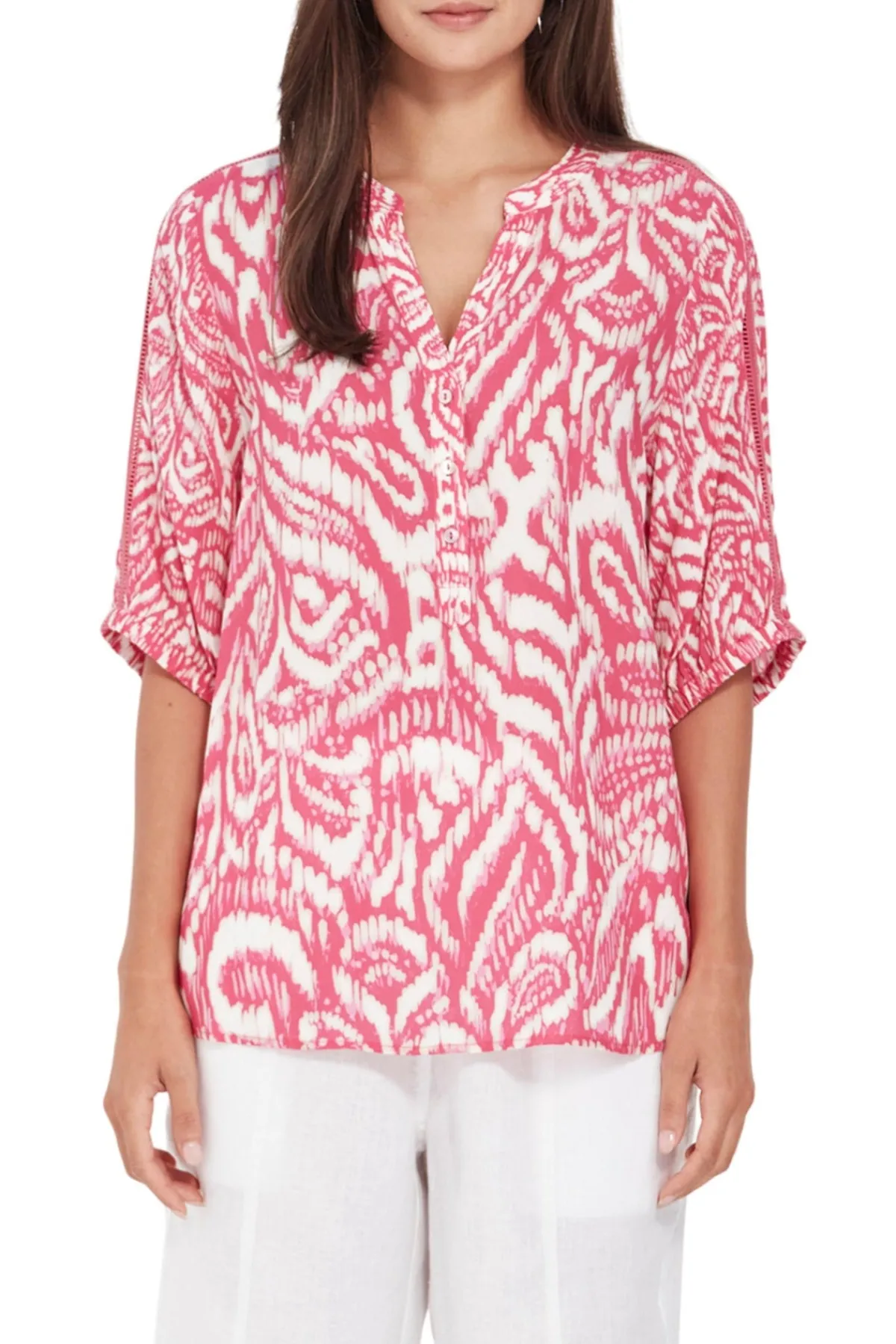 The Vale Top features a structured half placket with a V neckline for a clean, modern finish. Lace insert detailing runs through the shoulder and down the length of the sleeve, adding a feminine touch. The sleeve gathers into a soft elastic cuff for ease and comfort. Crafted from soft-touch rayon, it skims the hip with a curved hem, an effortless piece to dress up or down.