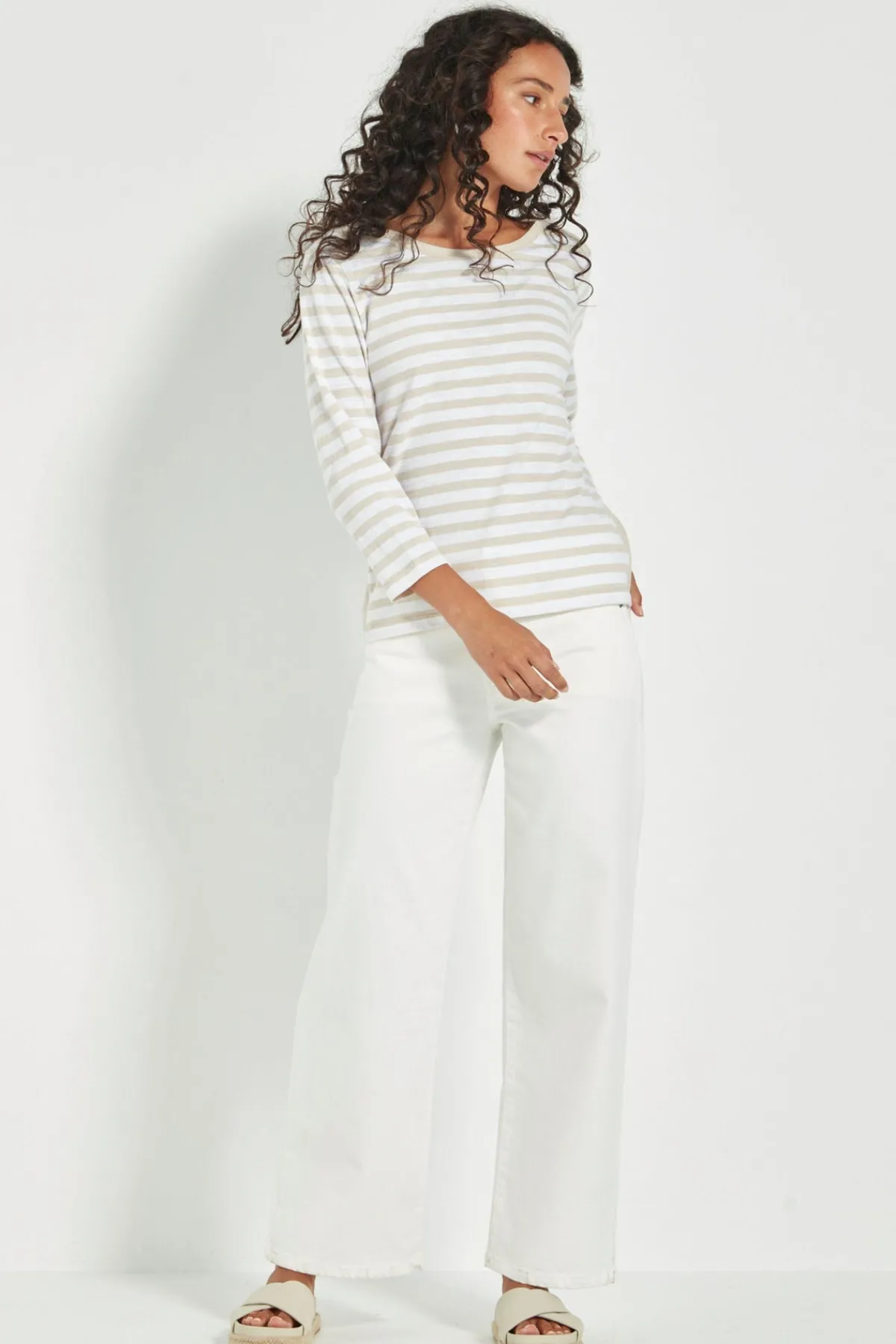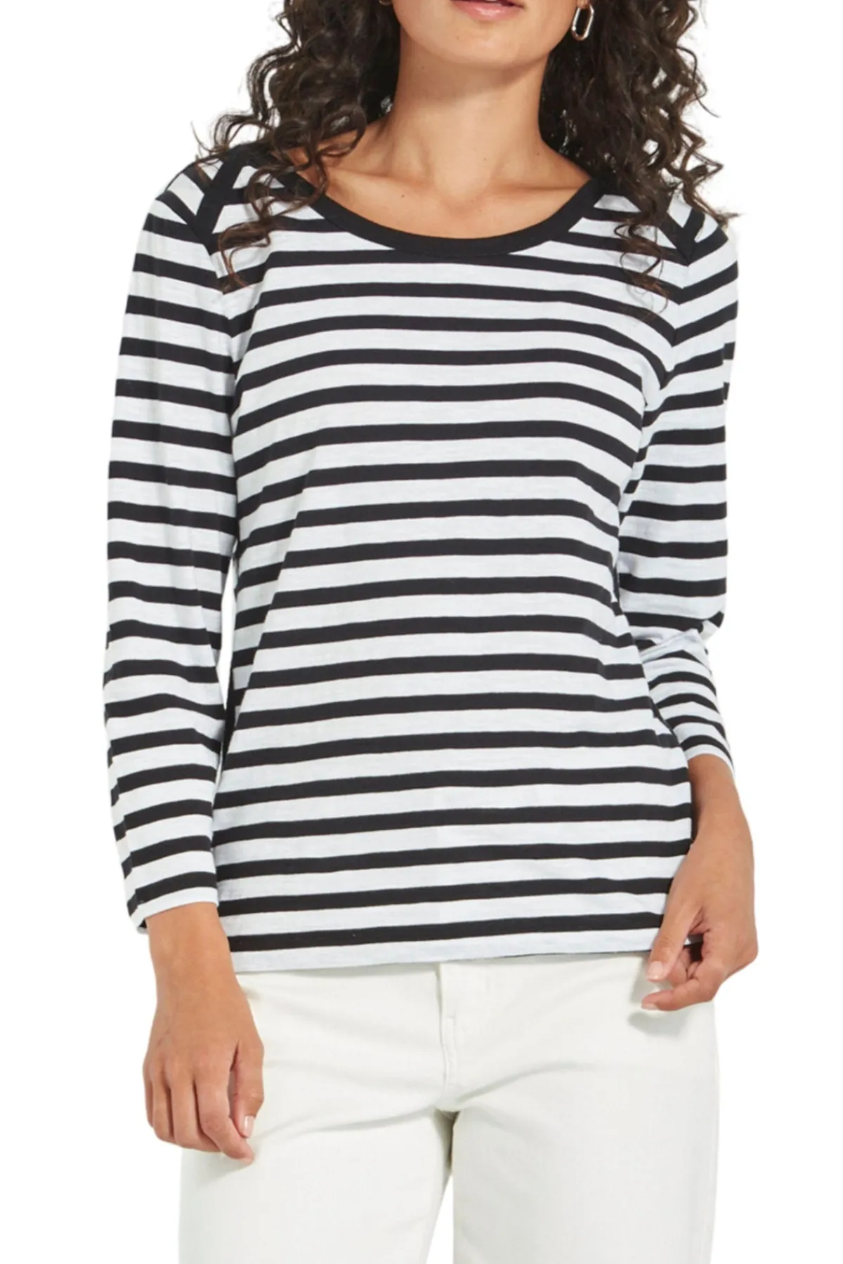 The Horizon top is a sophisticated and modern addition to any wardrobe. Made from a comfortable and soft Stripe 100% Cotton, it features a unique angled stripe detail on the shoulders and a flattering rounded neckline. With elevated tape trim detail on the neckline, shoulder and each side of the top for interest. The full length sleeves and hip-length hem make it versatile for any occasion.
