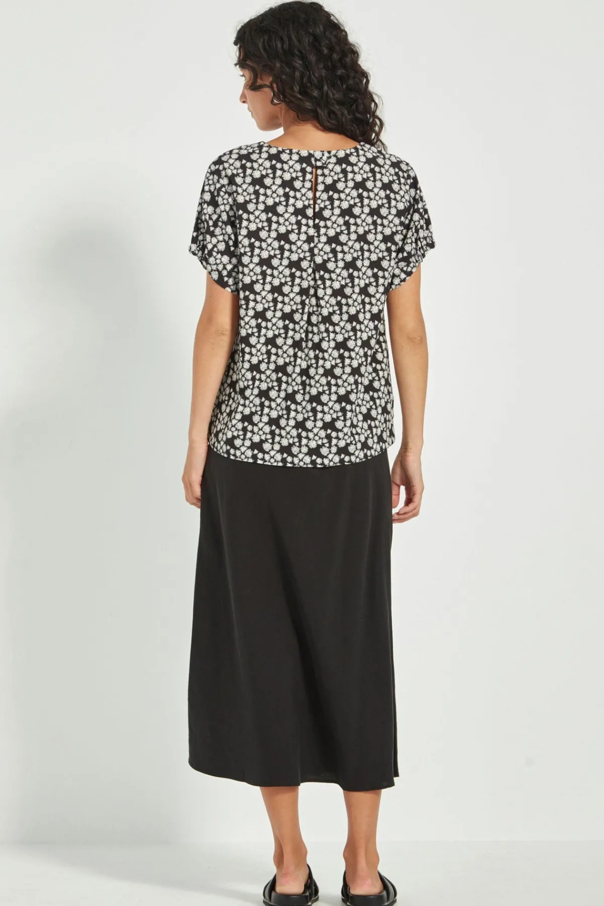 The Pixie Top features a delicate black and white ditzy print with a subtle hint of green. Designed with a smaller frame, it offers a flattering V-neck and set-in sleeves with elasticated hems. Details include side splits and a back tab secured with a self-covered button. Made from stretch fabric, it’s an easy, stylish choice for everyday wear—perfect to pair with pants or skirts, skimming the hip for a flattering fit.