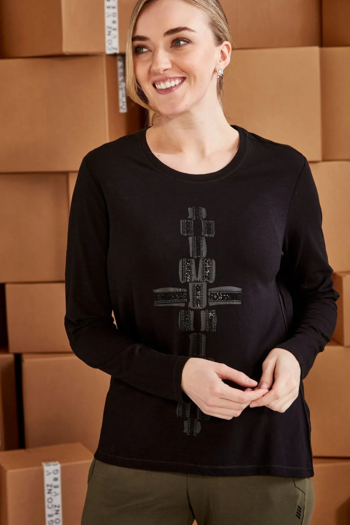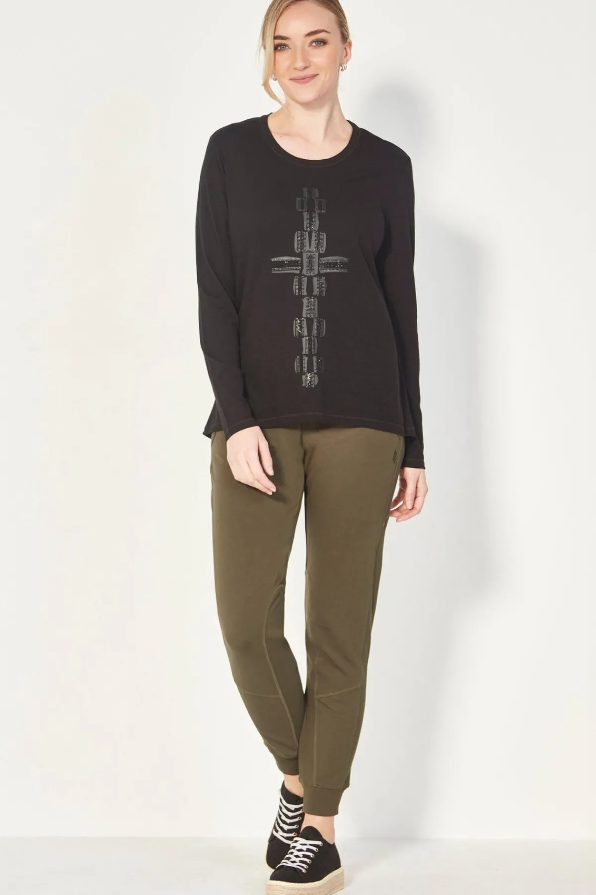Cotton/Modal top with rounded neckline and feature print with hotfix detail on front. Fit and flare shaped top. Bracelet length sleeve. The Joss top falls just below the hip.