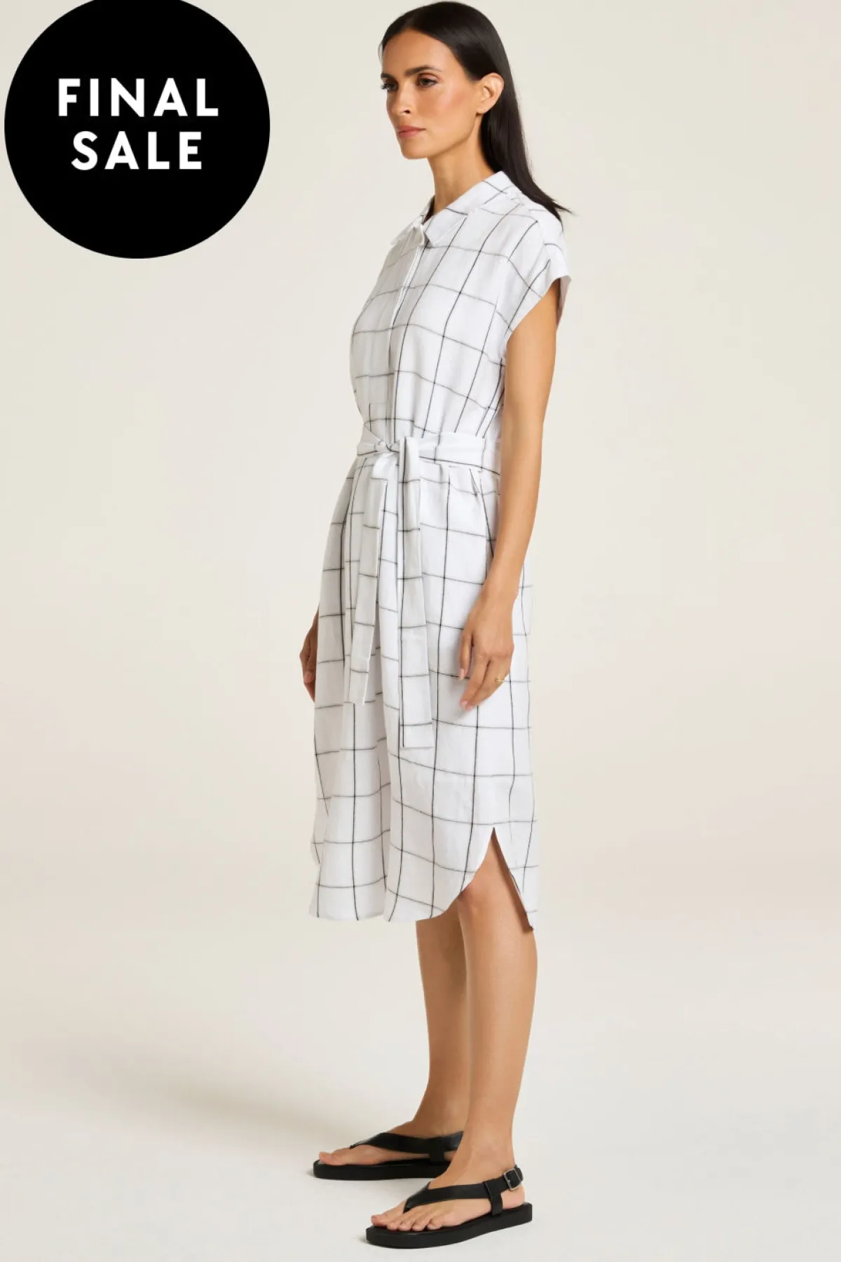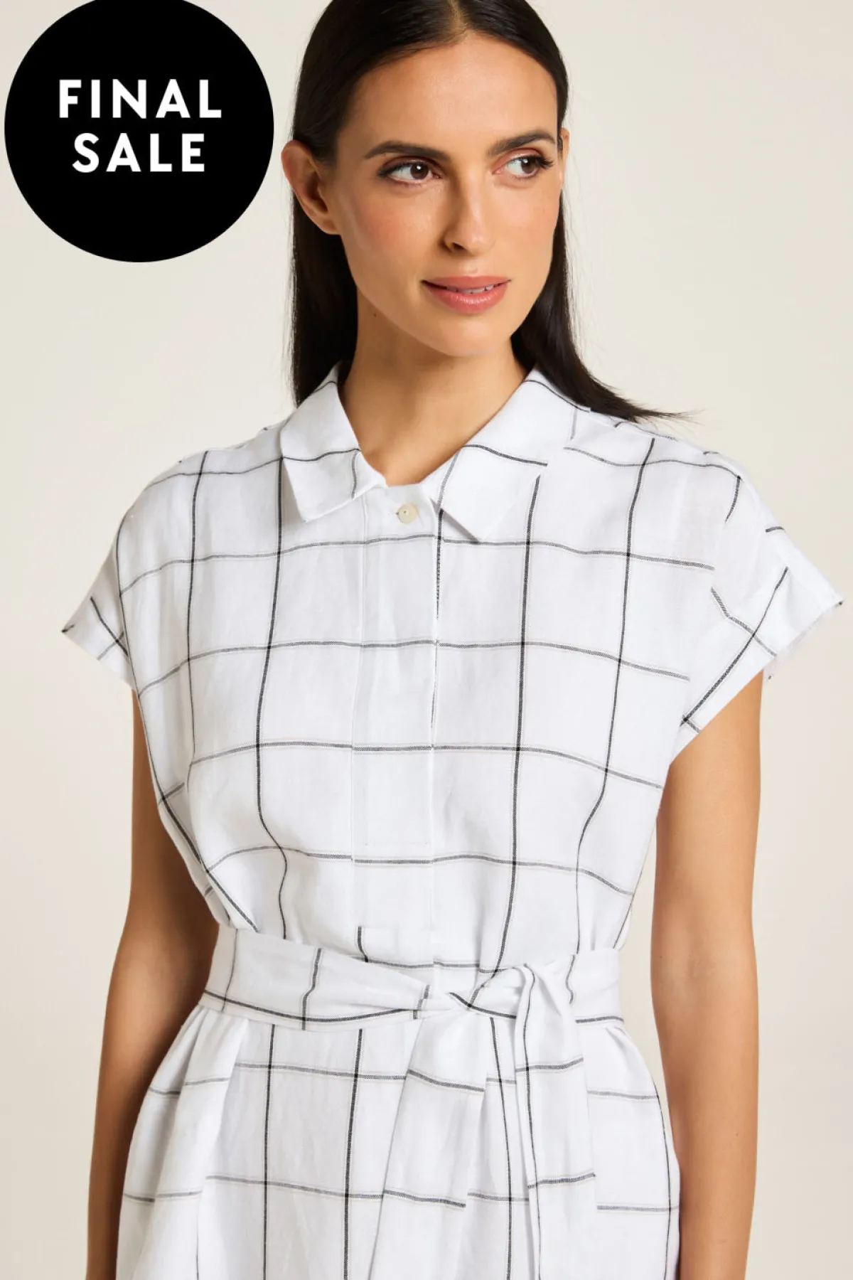 The Sentosa Dress epitomises minimal elegance with its exclusive yarn-dyed check pattern. Featuring a convertible collar and a concealed placket with a pleat, it includes extended sleeves and a waist tie for a relaxed fit. The knee-length design has a curved front hem with a split, while side pockets add practicality. Fully lined, it combines modern simplicity with timeless style, perfect for your summer wardrobe.