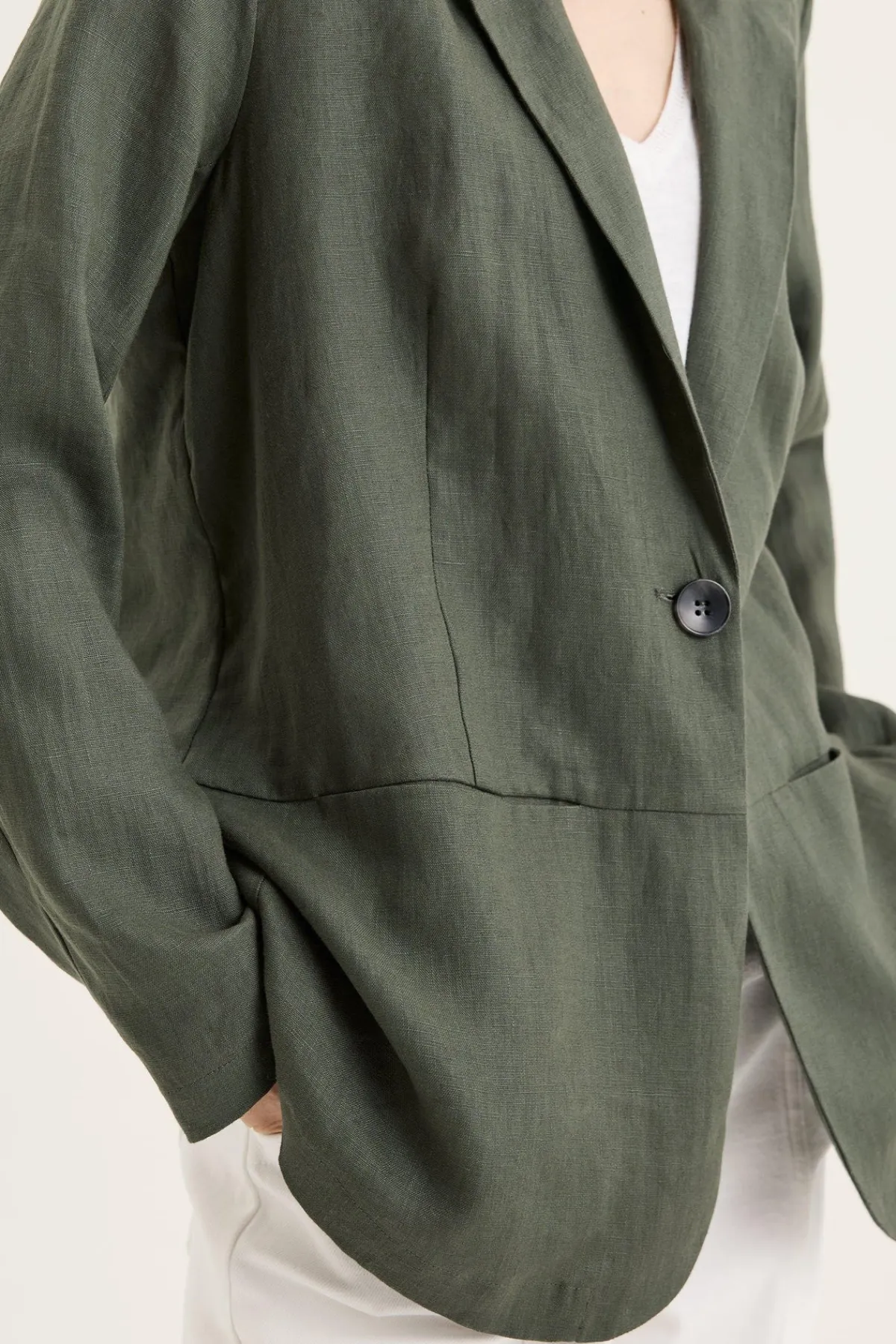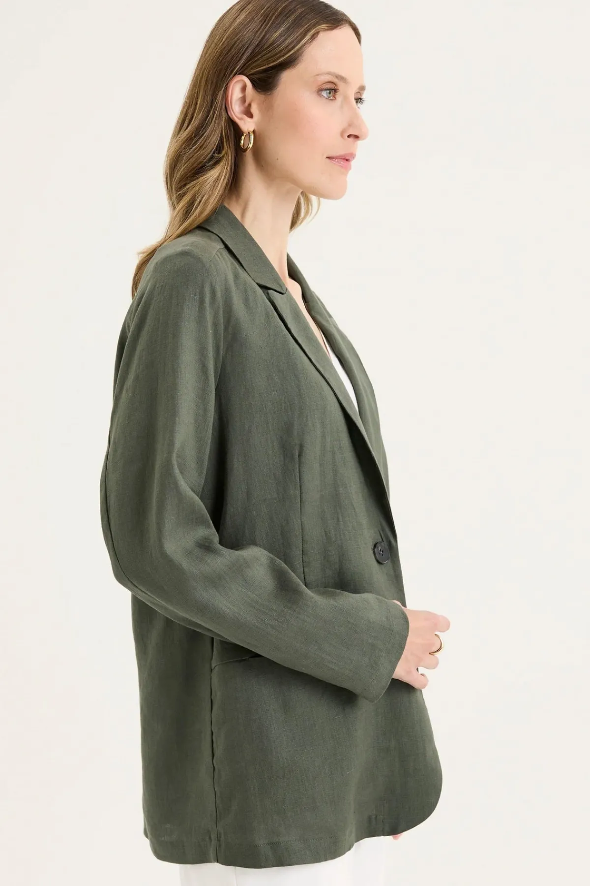 A contemporary linen blazer in a flattering olive green. The Bodhi Jacket is crafted from 100% linen with a relaxed fit that brings effortless elegance to your wardrobe. Designed with a classic collar and lapel, this long sleeve women’s blazer features a single breasted silhouette with an internal bind for a neat, refined finish. Functional side pockets add practical detail to this versatile linen jacket. The relaxed tailoring and rich olive tone offer endless styling possibilities – layer over tailored trousers and a silk camisole for polished dressing, or pair with denim and a simple tee for elevated everyday wear. A timeless blazer and seasonless wardrobe essential crafted with longevity in mind.