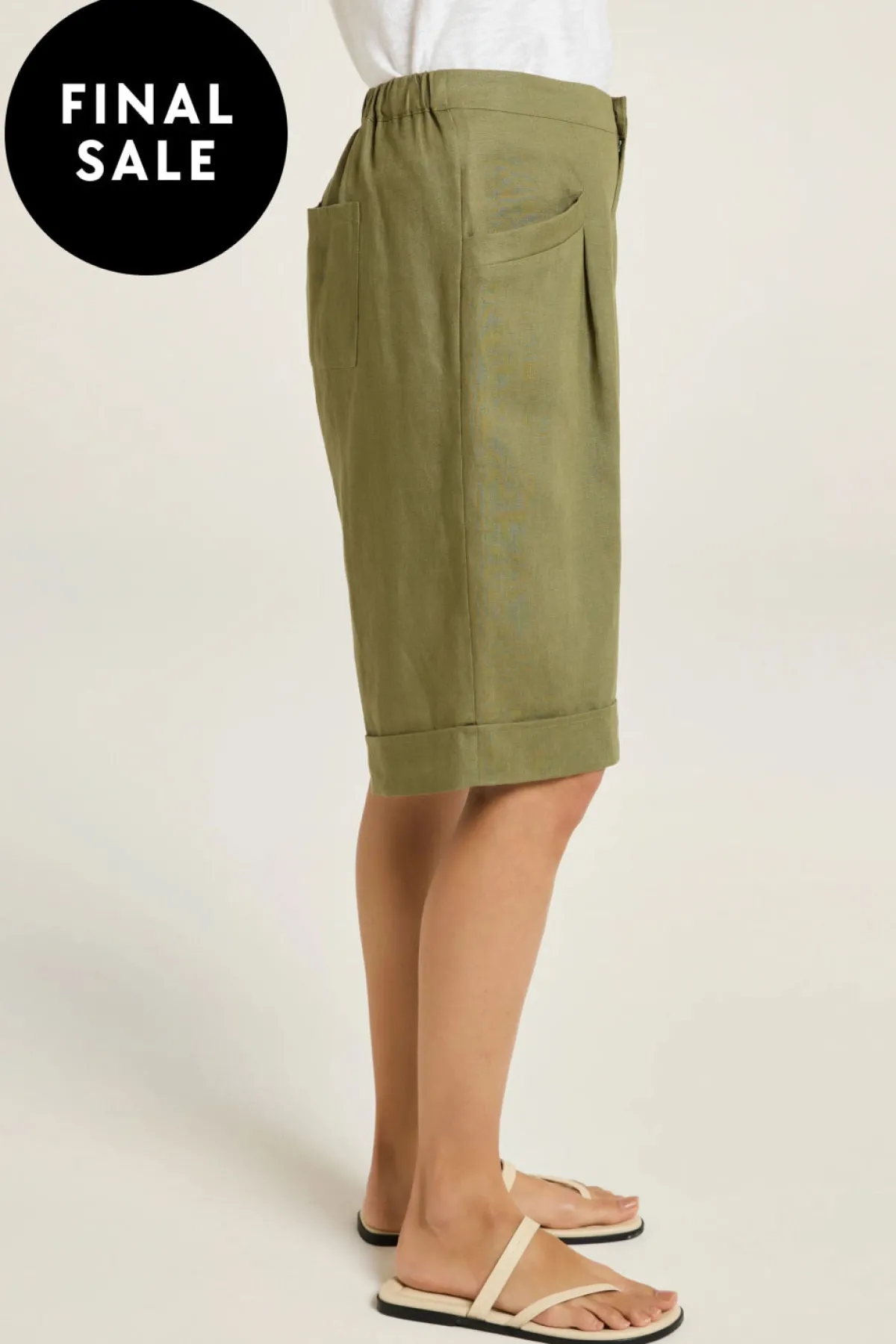 Elevate your summer style with our chic Bermuda shorts, crafted from 100% linen. Featuring single front pleats, angled side pockets, and a wide-band hem, they offer a contemporary look. Back patch pockets and a half-elasticated waistband add comfort and functionality.