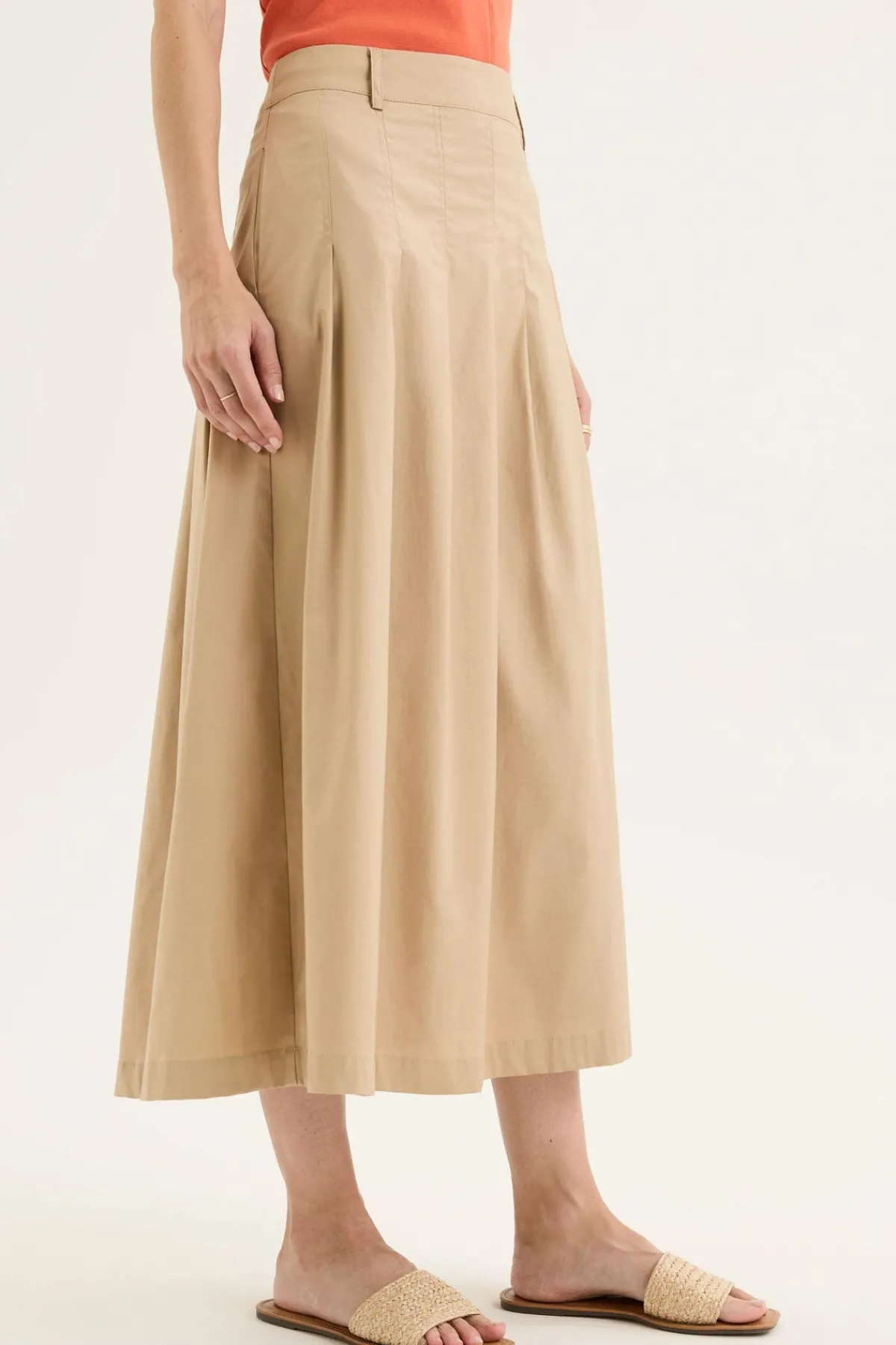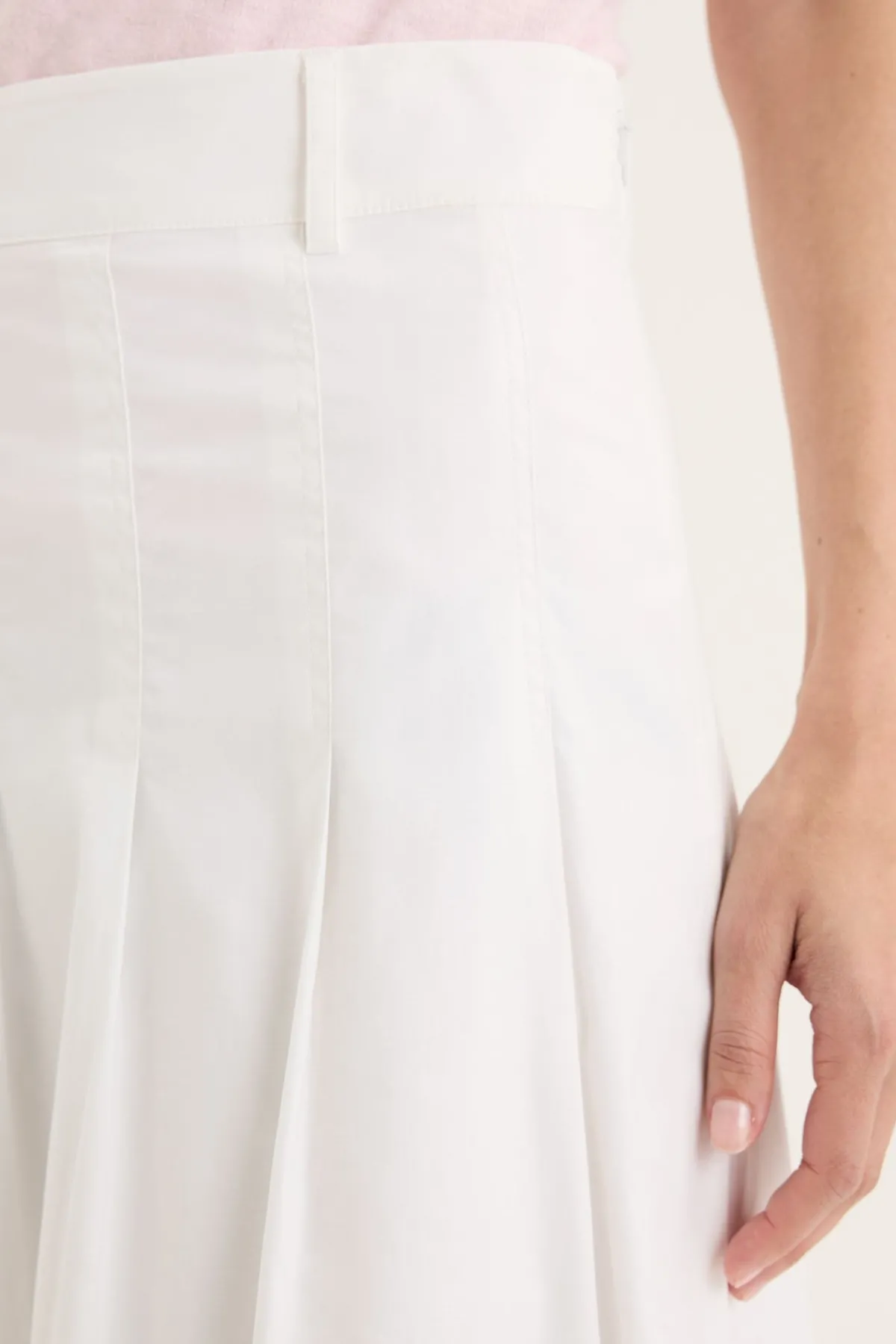 The Petal Skirt is a refined take on everyday femininity, combining soft structure with thoughtful detail. Cut in a flattering A-line silhouette, this midi-length skirt features front and back pintucks that add gentle dimension, enhancing its graceful shape. A fixed waistband with belt loops offers a tailored finish and styling versatility, while the invisible side zip keeps the look clean. Crafted from a breathable cotton blend with a touch of stretch, it moves with ease and comfort. Falling to the calf, this is a beautifully made skirt with a timeless feel – easy to dress up or down, and a quiet blend of pretty and utility for any wardrobe