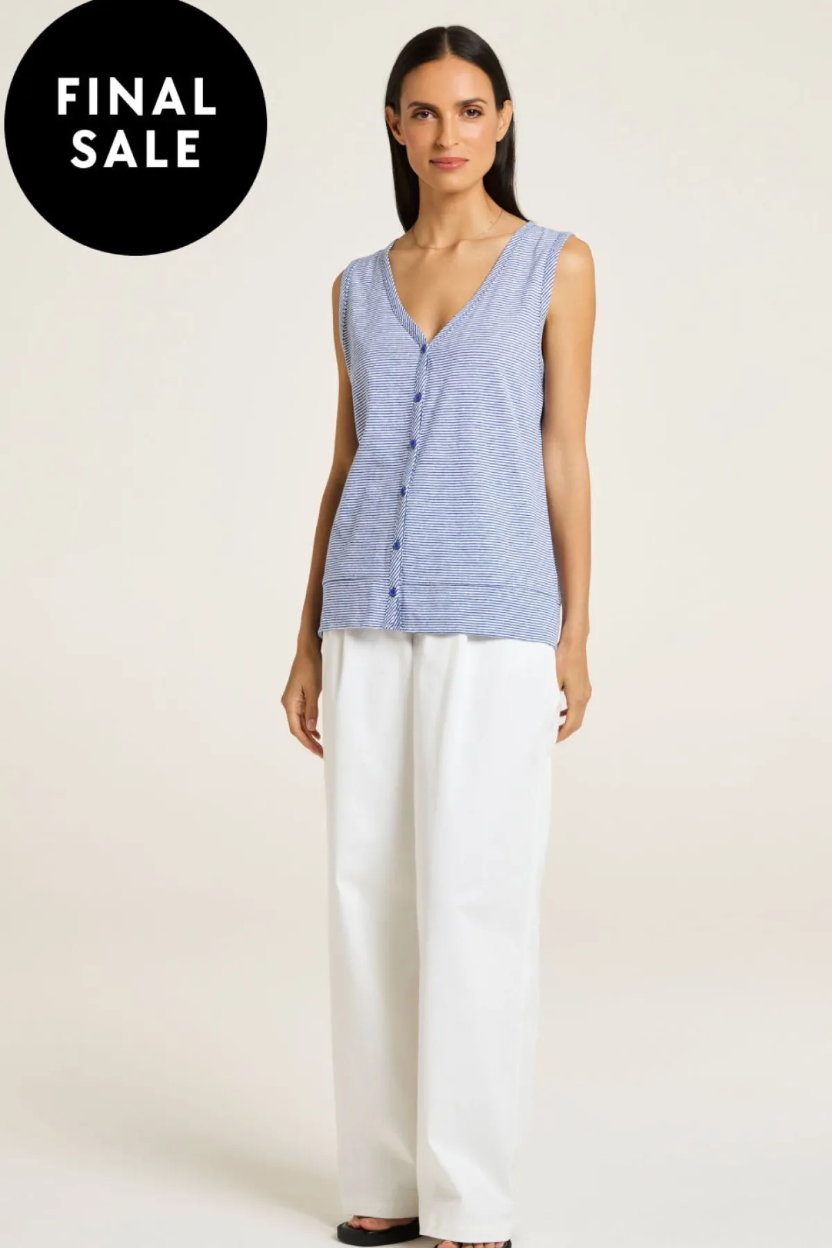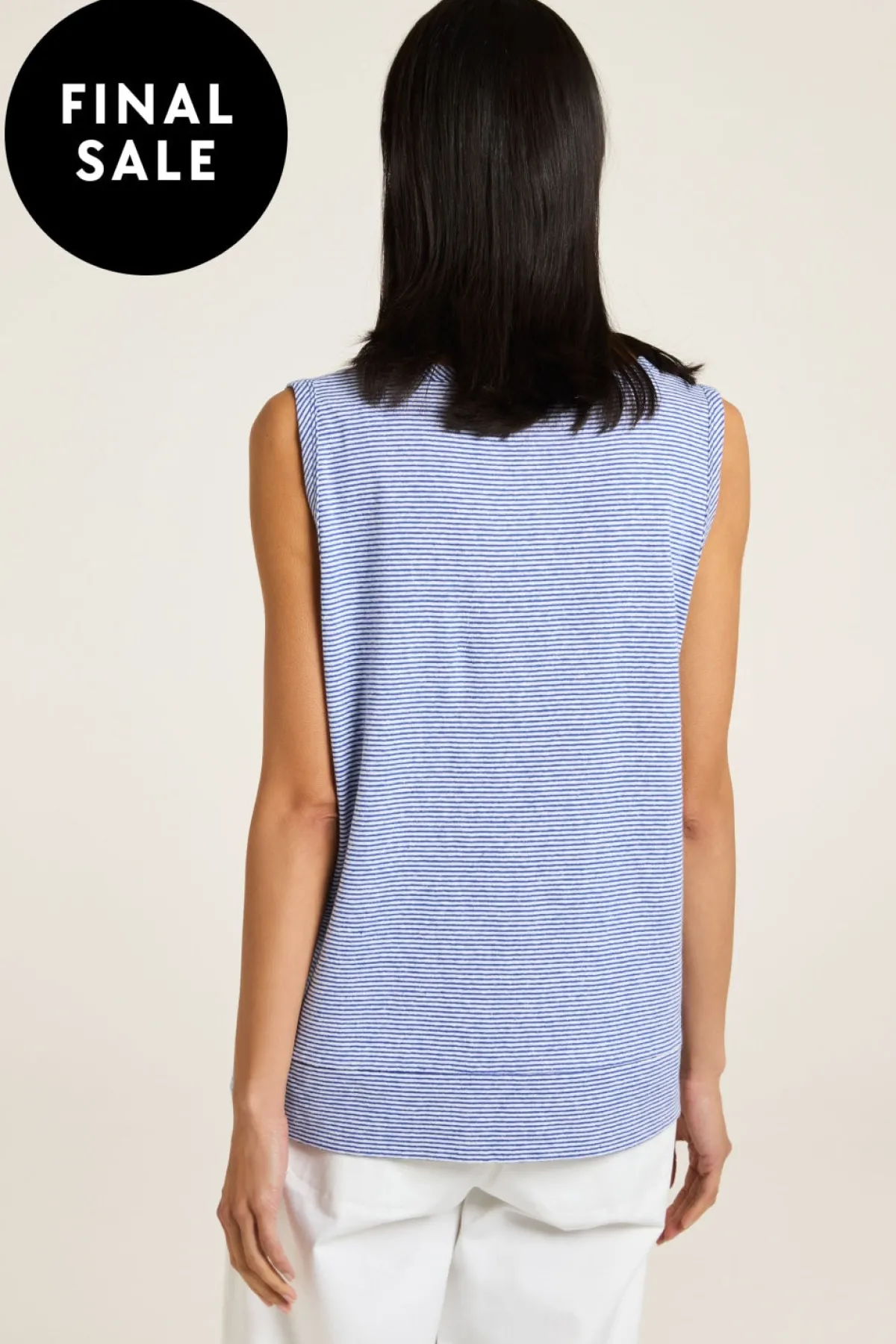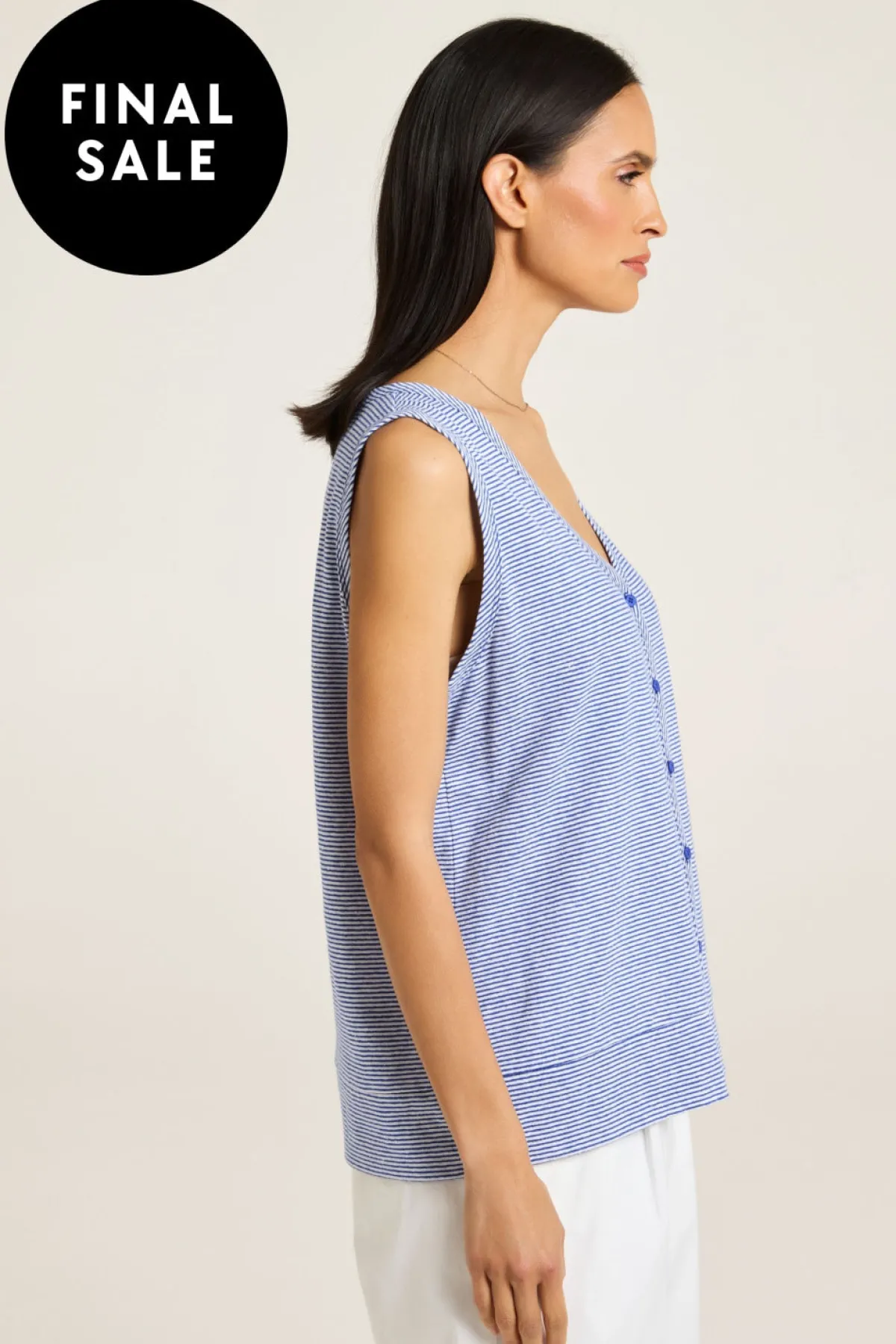 Inviting summer fun and freedom, the Dahlia tank offers them both in exclusive designer stripes, from slub jersey fabric. The banded V neckline and banded armholes are finely and quality-finished. Style it relaxed or tuck it into a denim skirt for a chic ensemble.