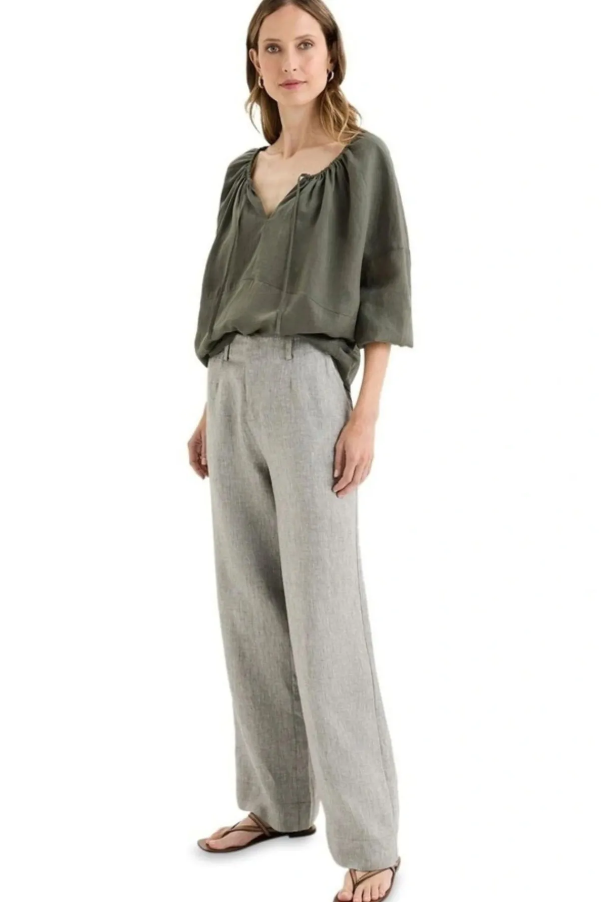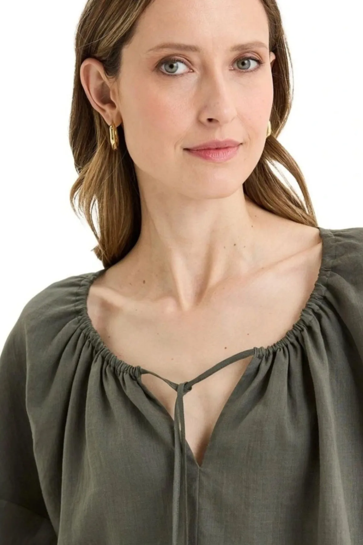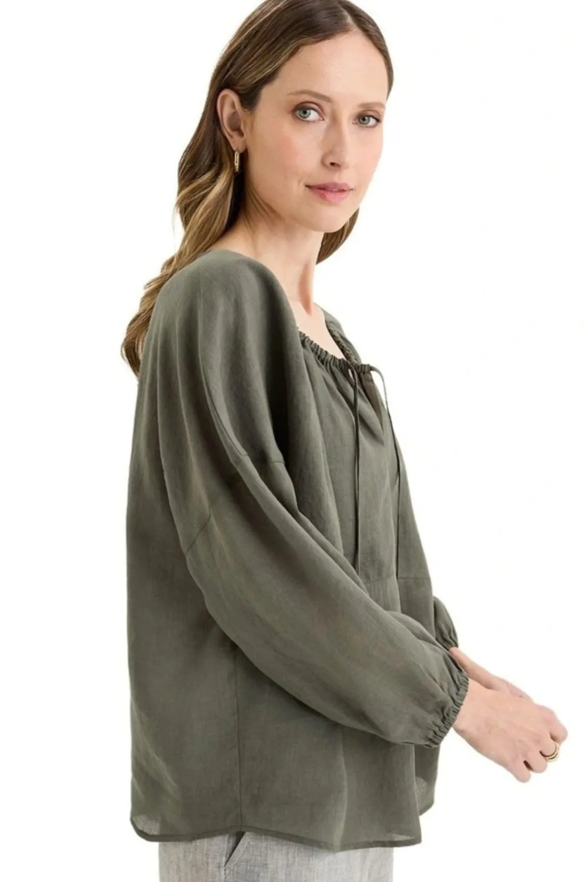 The Bohdi Top blends soft, bohemian-inspired flow with classic Yarra Trail detail. Crafted from a lustrous ramie-tencel blend, it drapes beautifully and moves with ease, offering a lightweight linen-like texture. The cut-away round neckline can be styled two ways – worn open for a relaxed V-neck effect, or drawn in with the encased drawstring for a softly gathered, rounded shape. Featuring a double-layered front yoke for structure, drop-shoulder sleeves with elastic cuffs for volume, and a high-low hem to enhance the flattering silhouette, it’s a versatile piece that is equally suited to casual days or elevated layering.