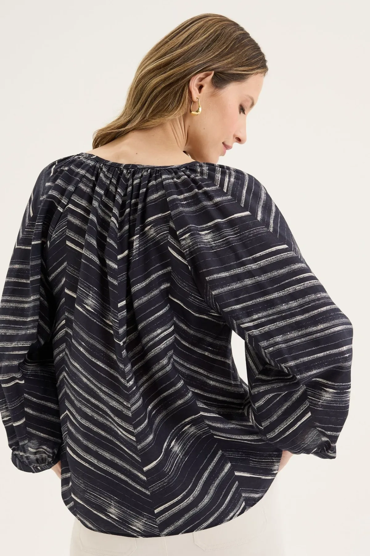 The Fleeting Top captures movement and lightness in every detail. Designed with an angular painterly stripe print exclusive to Yarra Trail, it drapes in a relaxed silhouette that feels effortless to wear. The round neckline features a cut-away front with delicate drawstring ties that can be worn open for a casual V-neck look, or tied for a more gathered shape. Semi-gathered raglan sleeves finish at a breezy three-quarter length, adding soft volume and flow. Wispy, weightless, and quietly striking, it’s a blouse that brings softness and artistry to everyday dressing.