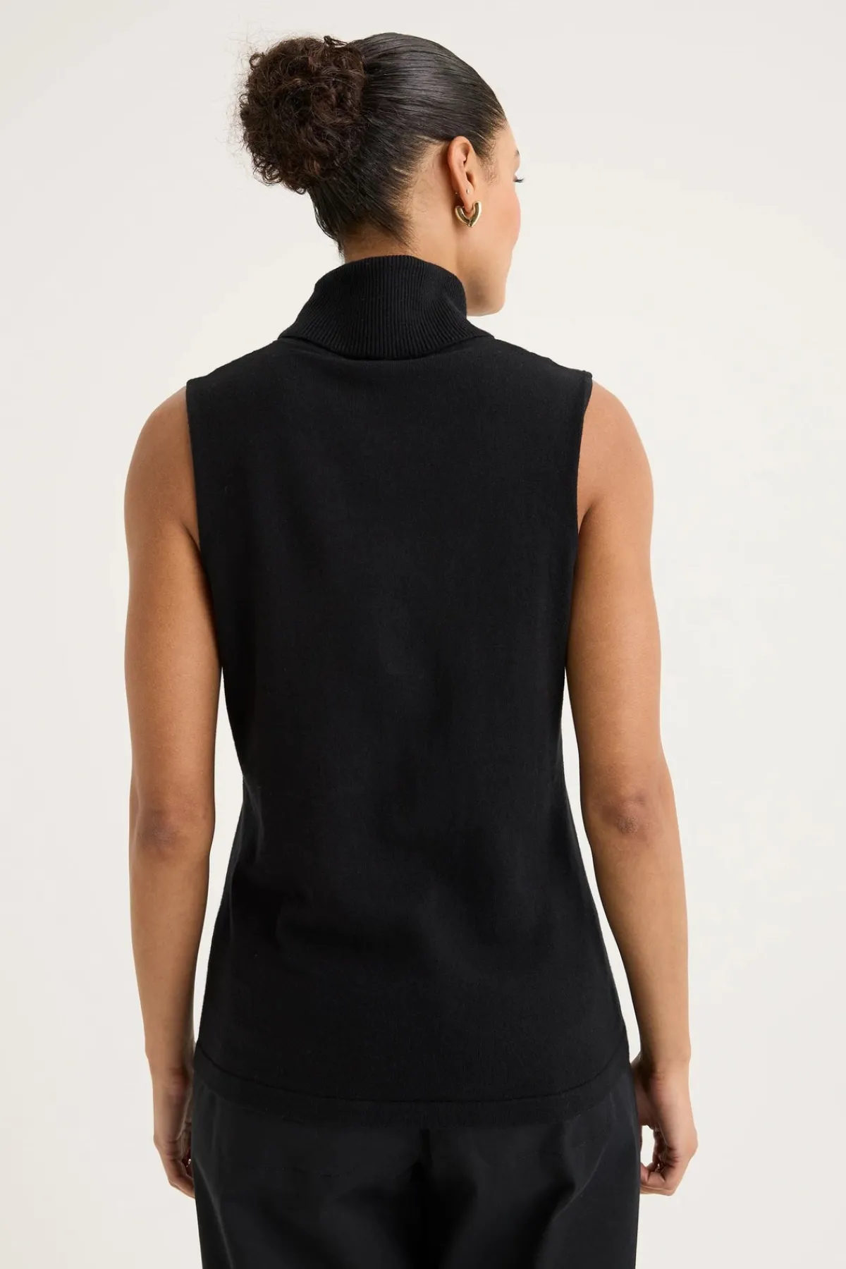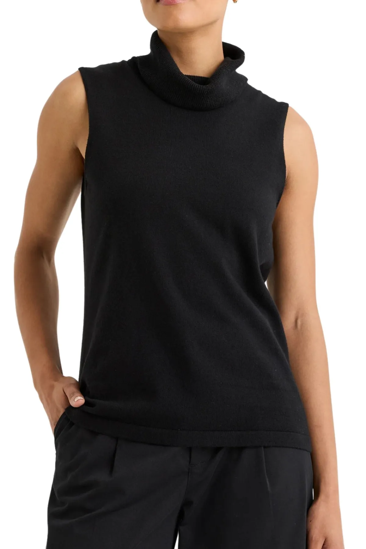- High, ribbed, rolled neckline